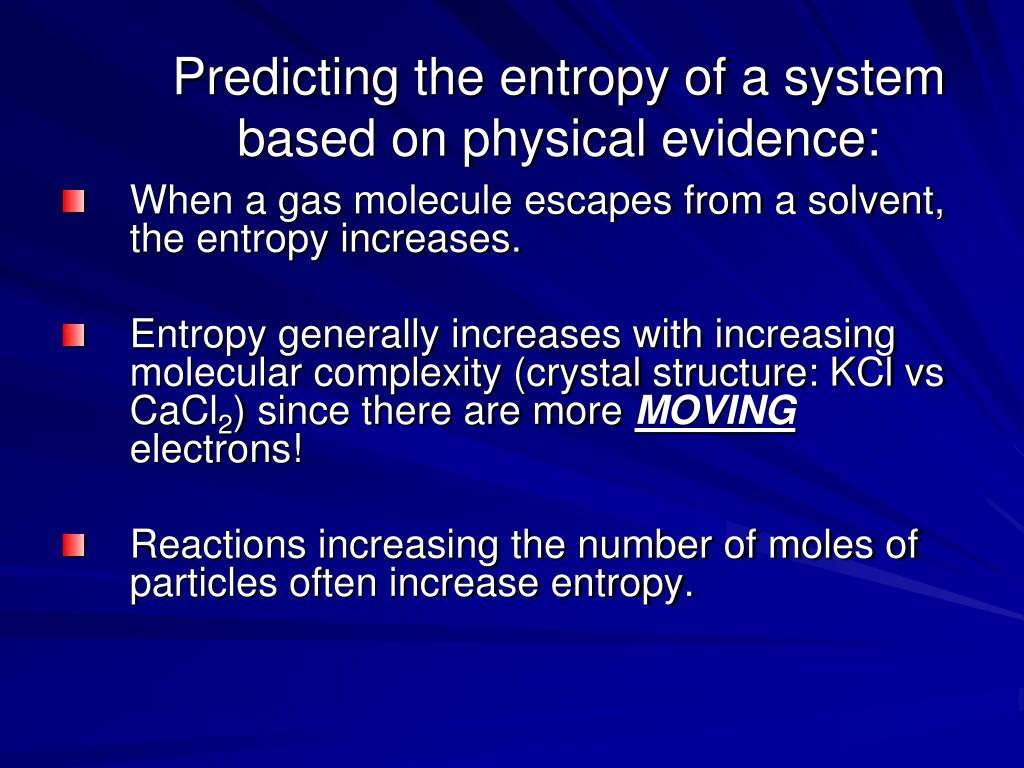 Predicting the entropy of a system based on physical evidence: • When a gas molecule escapes from a solvent, the entropy increases. • Entropy generally increases with increasing molecular complexity (crystal structure: KCl vs CaCl2) since there are more MOVING electrons! • Reactions increasing the number of moles of particles often increase entropy.