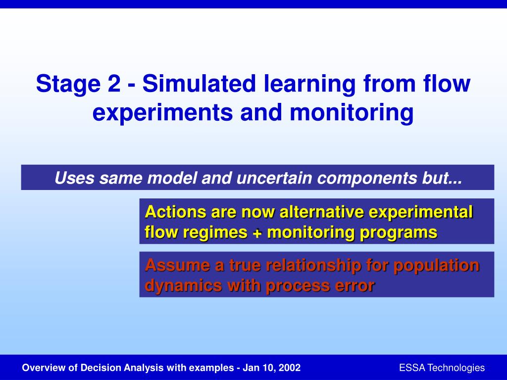 Stage 2 - Simulated learning from flow experiments and monitoring Uses same model and uncertain components but... Actions are now alternative experimental flow regimes + monitoring programs Assume a true relationship for population dynamics with process error