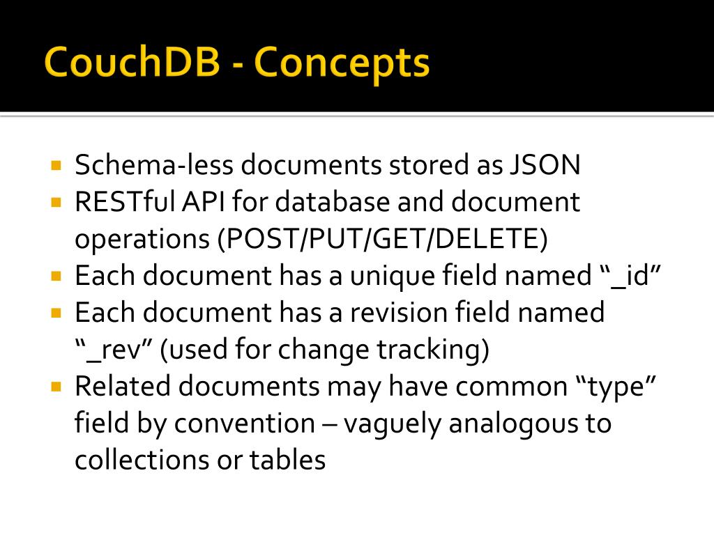 CouchDB - Concepts • Schema-less documents stored as JSON • RESTful API for database and document operations (POST/PUT/GET/DELETE) • Each document has a unique field named “_id” • Each document has a revision field named “_rev” (used for change tracking) • Related documents may have common “type” field by convention – vaguely analogous to collections or tables