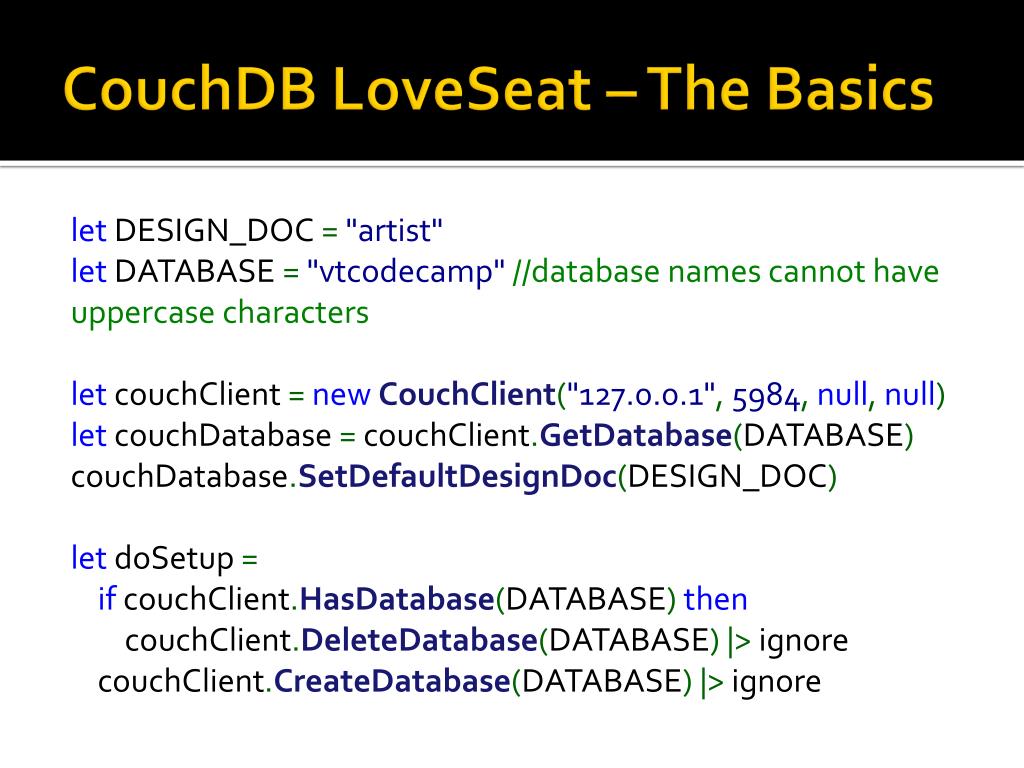 CouchDBLoveSeat – The Basics let DESIGN_DOC ="artist"let DATABASE ="vtcodecamp"//database names cannot have uppercase charactersletcouchClient=newCouchClient("127.0.0.1",5984,null,null)letcouchDatabase=couchClient.GetDatabase(DATABASE)couchDatabase.SetDefaultDesignDoc(DESIGN_DOC)letdoSetup=ifcouchClient.HasDatabase(DATABASE)thencouchClient.DeleteDatabase(DATABASE)|> ignorecouchClient.CreateDatabase(DATABASE)|> ignore