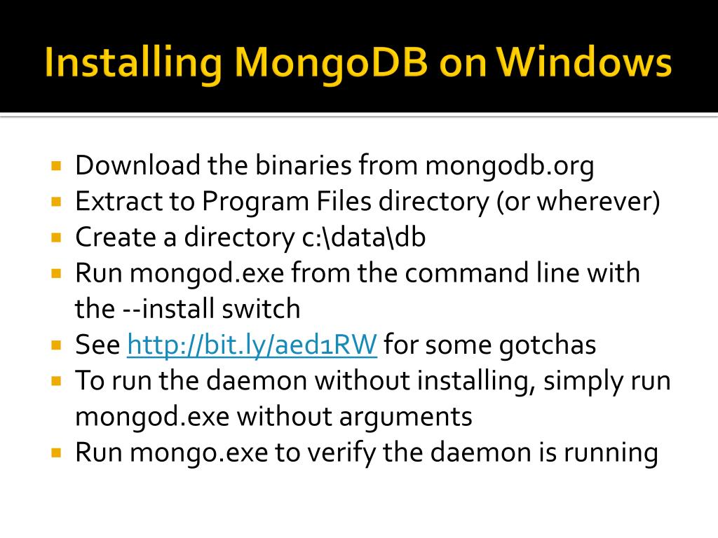 Installing MongoDB on Windows • Download the binaries from mongodb.org • Extract to Program Files directory (or wherever) • Create a directory c:\data\db • Run mongod.exe from the command line with the --install switch • See http://bit.ly/aed1RW for some gotchas • To run the daemon without installing, simply run mongod.exe without arguments • Run mongo.exe to verify the daemon is running