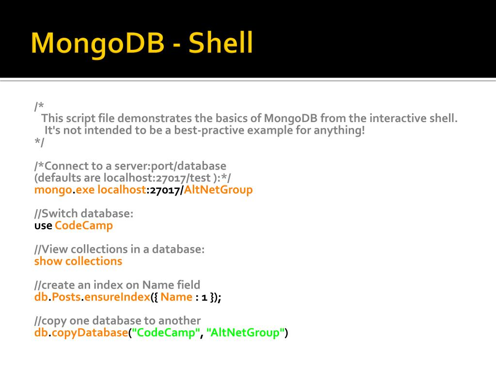 MongoDB - Shell /* This script file demonstrates the basics of MongoDB from the interactive shell. It's not intended to be a best-practive example for anything! */ /*Connect to a server:port/database (defaults are localhost:27017/test ):*/mongo.exelocalhost:27017/AltNetGroup//Switch database:use CodeCamp//View collections in a database:showcollections//create an index on Name fielddb.Posts.ensureIndex({ Name : 1 });//copy one database to anotherdb.copyDatabase("CodeCamp", "AltNetGroup")