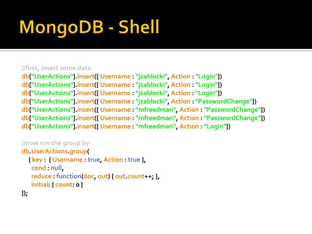 MongoDB - Shell //first, insert some datadb["UserActions"].insert({ Username : "jzablocki", Action : "Login"})db["UserActions"].insert({ Username : "jzablocki", Action : "Login"})db["UserActions"].insert({ Username : "jzablocki", Action : "Login"})db["UserActions"].insert({ Username : "jzablocki", Action : "PasswordChange"})db["UserActions"].insert({ Username : "mfreedman", Action : "PasswordChange"})db["UserActions"].insert({ Username : "mfreedman", Action : "PasswordChange"})db["UserActions"].insert({ Username : "mfreedman", Action : "Login"})//now run the group bydb.UserActions.group( { key : { Username : true, Action : true },cond : null,reduce : function(doc, out) { out.count++; },initial: { count: 0 }});