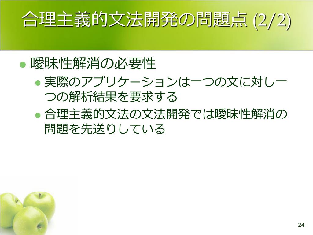 合理主義的文法開発の問題点 (2/2) • 曖昧性解消の必要性 • 実際のアプリケーションは一つの文に対し一つの解析結果を要求する • 合理主義的文法の文法開発では曖昧性解消の問題を先送りしている
