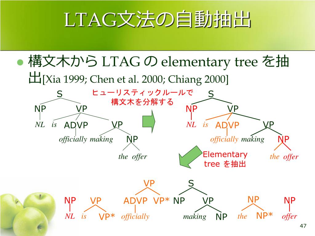 LTAG文法の自動抽出 • 構文木から LTAG の elementary tree を抽出[Xia 1999; Chen et al. 2000; Chiang 2000] ヒューリスティックルールで構文木を分解する S S NP VP NP VP VP VP is is NL NL ADVP ADVP NP NP officially making officially making Elementarytree を抽出 the offer the offer VP S NP NP NP VP ADVP VP* NP VP NP* NL is the offer VP* officially making NP