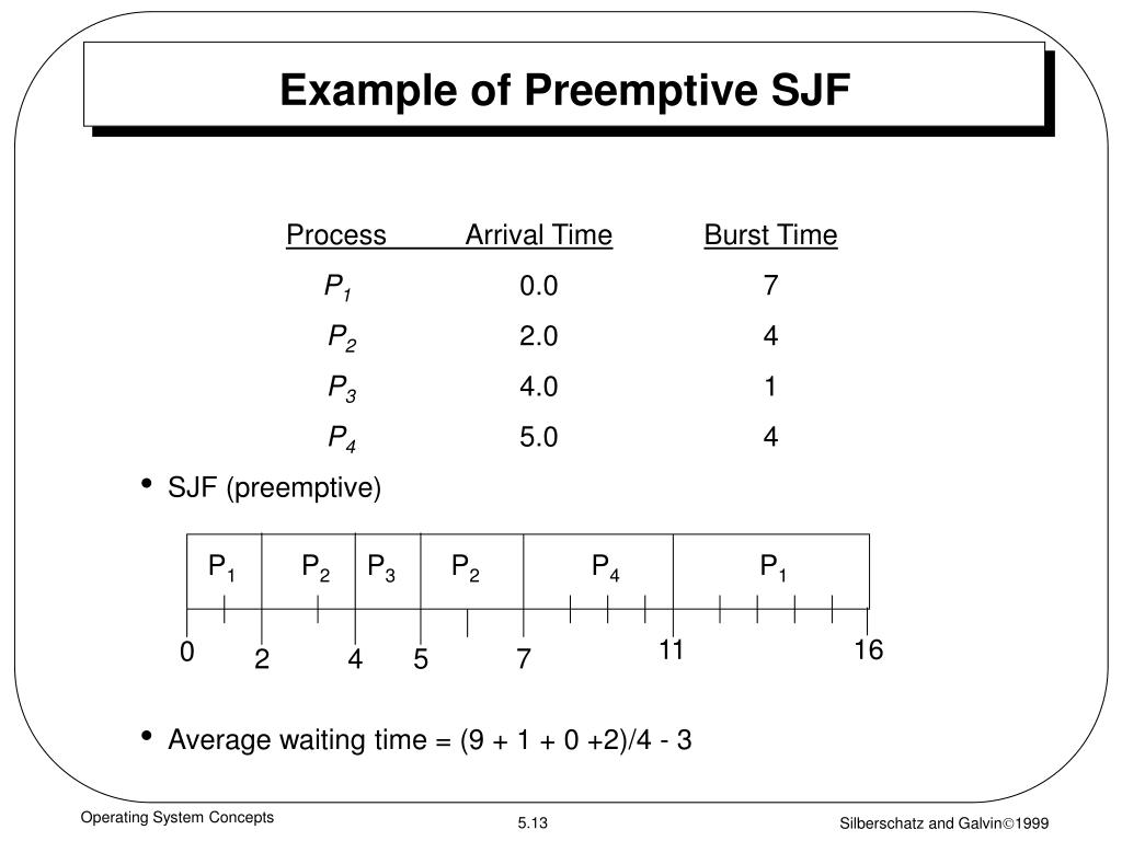 Example of Non-Preemptive SJF Process Arrival TimeBurst Time P1 0.0 7 P2 2.0 4 P3 4.0 1 P4 5.0 4 • SJF (non-preemptive) • Average waiting time = (0 + 6 + 3 + 7)/4 - 4 P1 P3 P2 P4 0 3 7 8 12 16 Operating System Concepts