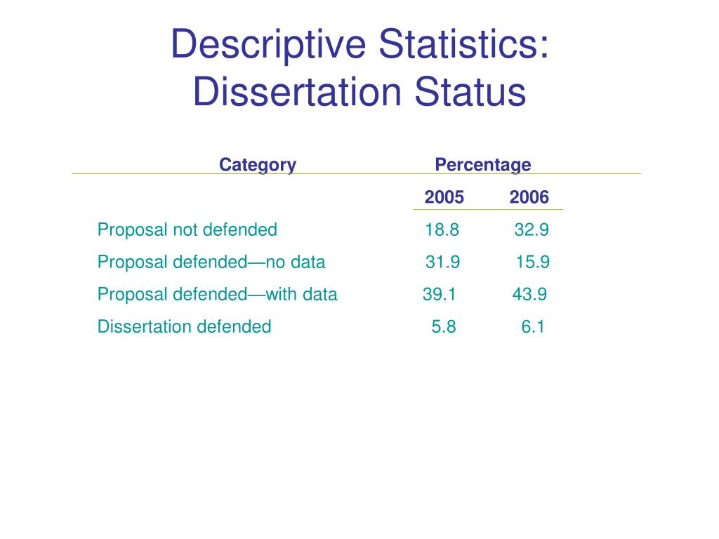 Descriptive Statistics:Dissertation Status Category Percentage 2005 2006 Proposal not defended 18.8 32.9 Proposal defended—no data 31.9 15.9 Proposal defended—with data 39.1 43.9 Dissertation defended 5.8 6.1