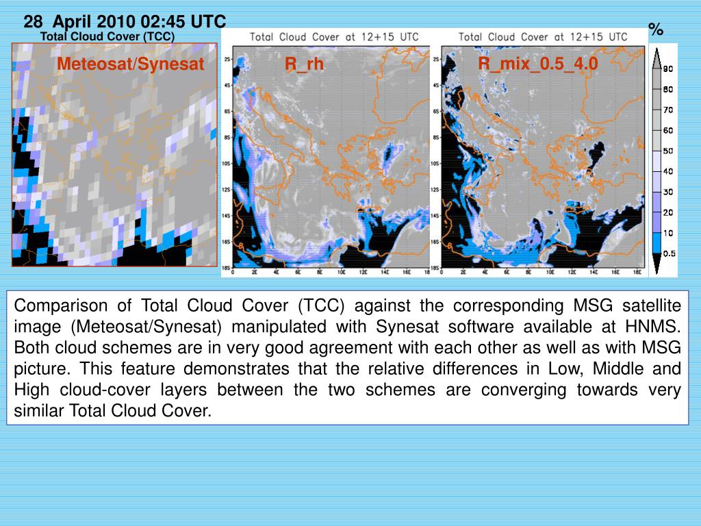 28 April 2010 02:45 UTC % High Cloud Cover (HCC) R_mix_0.5_4.0 Meteosat/Synesat R_rh Comparison of High Cloud Cover (HCC) against the corresponding MSG satellite image (Meteosat/Synesat) manipulated with Synesat software available at HNMS. In reference to MSG picture, both cloud schemes overestimate HCC, especially over the West/South-West parts, addressing the issue of proper accounting of cloud-ice content. In contrast to LCC and MCC and in reference to the satellite picture, the relative-humidity scheme provides a better tendency to resolve the cloudiness, while the cloud structure of the mixed-phase scheme has the tendency to remain more compact.