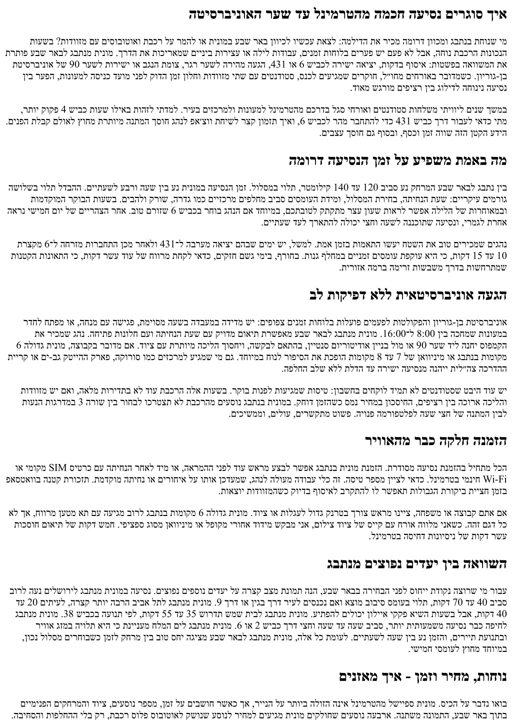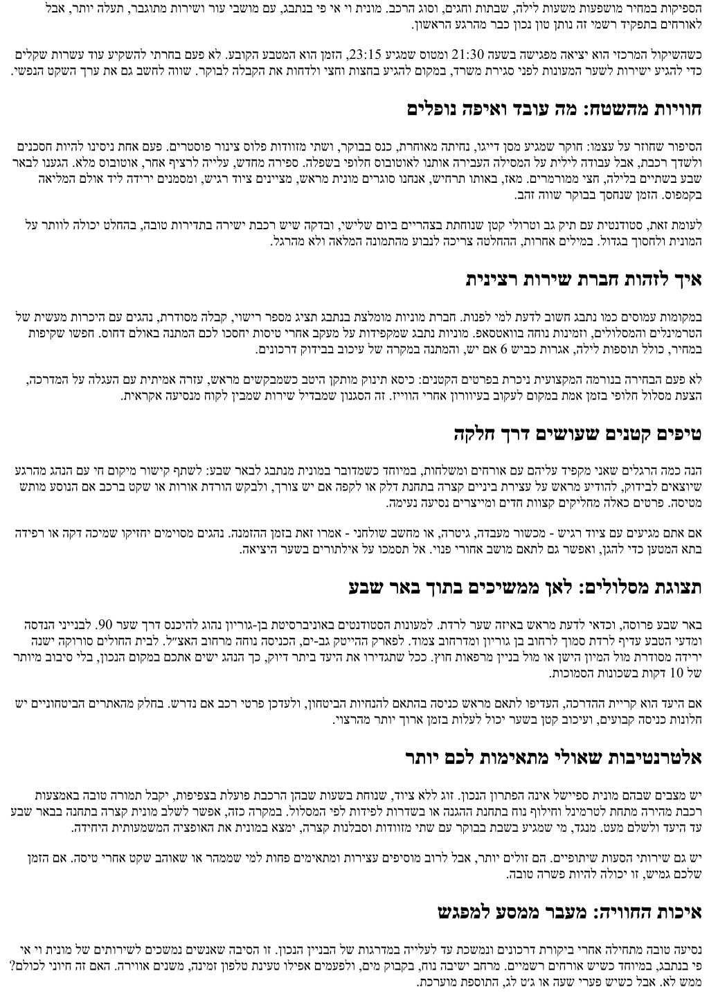 אל תוחוקלה בור ,ףוסב .ףוקש לולסמ לוהינו ,תמאותמ תחא הריצע ,תינונימ החיש ,הכומנ הקיזומ :הלועמ היווח רצייל רשפא ליגר תורישב םג .קויד םישפחמ םה ,הגצה םישפחמ העיסנה ינפל ןוכנה עדימה ןונימ ךרוצ ןיא .שי םא לולסמל הפדעהו ,דחוימ דויצ ,קיודמ דעי ,םיעסונ רפסמ ,הסיט רפסמ :םיבושח תמאבש םיטרפה תא קר וקפס ,םינימזמ םתאשכ םכניאש ונייצ ,ךרדב תלוכמב הרצק הינח םיכירצ םתא םא .םשבמב שמתשהל אלש ושקב ,תוחירל תושיגר םכל שי םא ,תאז תמועל .םייח רופיסב .המיענ העיסנל הרצקה ךרדה אוה קויד .תוקד שמחמ םיגרוח םהילע םירתוומ אלש םייתוחיטב םישגד לבא ,םתמזוימ ךכ לע ולאשי םיסונמ םיגהנ .קונית אסיכ וא רטסוב שרדנ םא שארמ ושקב .םיאתמ אסיכב םידלי ובישוה .הצלמה אל איה תוחיטב העיסנ דבכי גהנש .סומינב תאז ורמא ,םכמעטל ידמ רתוי רהממ גהנה םא .רוחאמ םג ,םיעסונה לכל תוחיטב תורוגח .םכילע רבד לש ופוסב תוירחאה .תורתוימ תופיקע ךות םיכסוחש יצחו הקד לע ףידע תינלבס תיסחי לדבה שיגרי ,הלק תושבייתהו הכורא הסיט ירחא עיגמש ימ .םדקומ ןגזמה תא תולעהל שקבל ושייבתת לא ,טסוגואו ילויב דחוימב ,ינוציק םוח ימיב .ןוינחב םימח בכרל לנימרטהמ היירט האיצי ןיב ביתנ ותואב םיפסונ םידעי בוליש .המורד ךישמהל ךכ רחאו דחא חרוא דירוהל ידכ שמש תיבב לשמל ,ךרדב הריצע תללוכ עבש ראבל ךרדה םימעפל םימעפל םויהו ,38 זאו 1 ךרד העיסנ לש בוליש התייה קוחרה רבעב שמש תיבל גבתנמ תינומ https://www.almaxpress.com/airporttocity םילשוריל אוה דעיה םא .הריצע תללוכה ריחמ תעצה לבקל ידכ שארמ הז תא רמול בושח .איגה רעש ןוויכל תולעל זאו 431 שיבכ רבחל ףידע .םיסמועב ההובג תונושו ןמז הפיסומ הריבה ריעל הסינכה יכ ,ידמ הכורא תפתושמ העיסנ םוקמב תועיסנ לוציפ לוקשל יאדכ ,ךרדב ןיב ןוכנ םואית שי םא םינוויכ ינשל בכר ףתשל תונמדזה םג וזו ,6 שיבכב ללכ ךרדב רחבת הפיחל גבתנמ תינומ :רחא רופיס רבכ הז הפיח ןוויכל .שימג הז הדובע תוצובקב לבא ,םיאתמ הז םלוכל אל .תועש ןתואב םיעיגמש םיעסונ ףוסיאה עגרו ,םירדסה ,םירות :תונימזה תלאש תצלמומ תוינומ תרבח לומ דחוימב ,שארמ ןימזמש ימ .רצק רות רצונ ,םיגחבו ץיקב רקיעב ,סמוע תופוקתב .תוינומל רדוסמ ףוסיא רוזא שי גבתנב תכלל רשפאש ןכדעל הווש ,בג קית םע קר םיעיגמ םתא םא .דומעל ןכיה תורורב תויחנהו התיחנה תעשל המאתה תוכזב רתוי רהמ םדקתי ,גבתנב .רתומ הדימע ןמז םע הכרדמ תדוקנל ברקתי גהנהש ףידע ,תובר תודווזמ שי םא .תוקד המכ ךוסחלו תינוציחה ףוסיאה תעוצרל לגרב תוחפב אטבתמ הז ,םכרובע .תוסנקב ךבתסהל ילב הרצק הריצע ןמזתלו ,םיחטבאמה תותוא תא ןוכנ אורקל םיעדוי הדשה חוקיפ תא םיריכמש םיגהנ .לנימרטהמ הייקנ הדירפו הנתמה גרדשל םלתשמ יתמ .ןוכנ דימת טעמכ גבתנב תומוקמ 6 הלודג תינומ וא ןאווינימל גורדש ,עסונ לכל הדווזמ וא ,הלעמו םיעסונ השולש שי םא :ילש ןויסינהמ עבצא ללכ ,תורחואמ הליל תועשל .פאסטאווב ןימז גהנו יביטקא הסיט בקעמ ללוכש תורישל גרדשל ולקש ,חישק םינמז חול וא שיגר דויצ לש הרקמ לכב - הליל ותוא לש הדובעה ילכל המאתהב אלא ,דבלב קוניפב רבודמ אל .תרבטצמ תופייע ךסוחו תונרע לע רמוש חונו לודג בכר ,23:00 ירחא דחוימב .סיסבה וקל םכתא ריזחמש בכרה חוכשל םיטונש תולע יטביה .סמועב תוקד 20 דע 15 ךוסחלו הרגאה תא םלשל םלתשמ םיתיעל לבא ,לולסמ לכב הבוח וניא הז .6 שיבכ תרגא לולכל יושע םורדל העיסנ ריחמ דצהמ .הרגא שיבכ םיפידעמ םתאש ןייצל הווש - העובק העשב םייתסמש ןיא ק׳צ וא ,םילוח תיבב תרמשמ ,השיגפ - הובג רחמותמ םכלש ןמזה םא בוכיע שי םא הנתמה לע תפסות יבגל שארמ ואדו ,רתוי בושח .יפולח שיבכ רוחבלו הרגאמ ענמיהל תושרופמ ושקב ,םירהממ אל םתא םא ,ינשה .התיחנה ירחא תוקד 60 דע 30 בורל ,בויח אלל הנתמה ןולח ועבקי םינגוה םיגהנ .קודיבב הגהה ירוחאמש תישונאה היווחה ולש רשקהו קטייהה קראפ לש תוחתפתהה לע רפסל עדי ,שיבכה לע ישילשה רושעב ,םהמ דחא .םינטק ךרד יכירדמ ךרובע ויהש םיגהנ יתשגפ העיסנ ךפוה םג אוה ,רזוע קר אל הזה עדיה .המישנל רוצעל םלתשמ הבש הדוקנו העש לעו הרובחתה יביתנב םיי