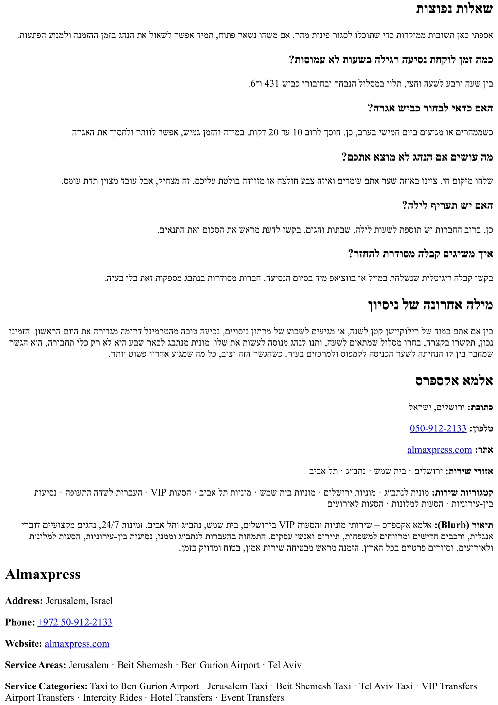 Blurb: ALMA Express provides premium taxi and VIP transfer services in Jerusalem, Beit Shemesh, Ben Gurion Airport, and Tel Aviv. Available 24/7 with professional English-speaking drivers and modern, spacious vehicles for families, tourists, and business travelers. We specialize in airport transfers, intercity rides, hotel and event transport, and private tours across Israel. Book in advance for reliable, safe, on-time service.