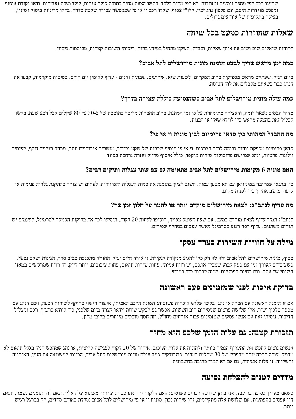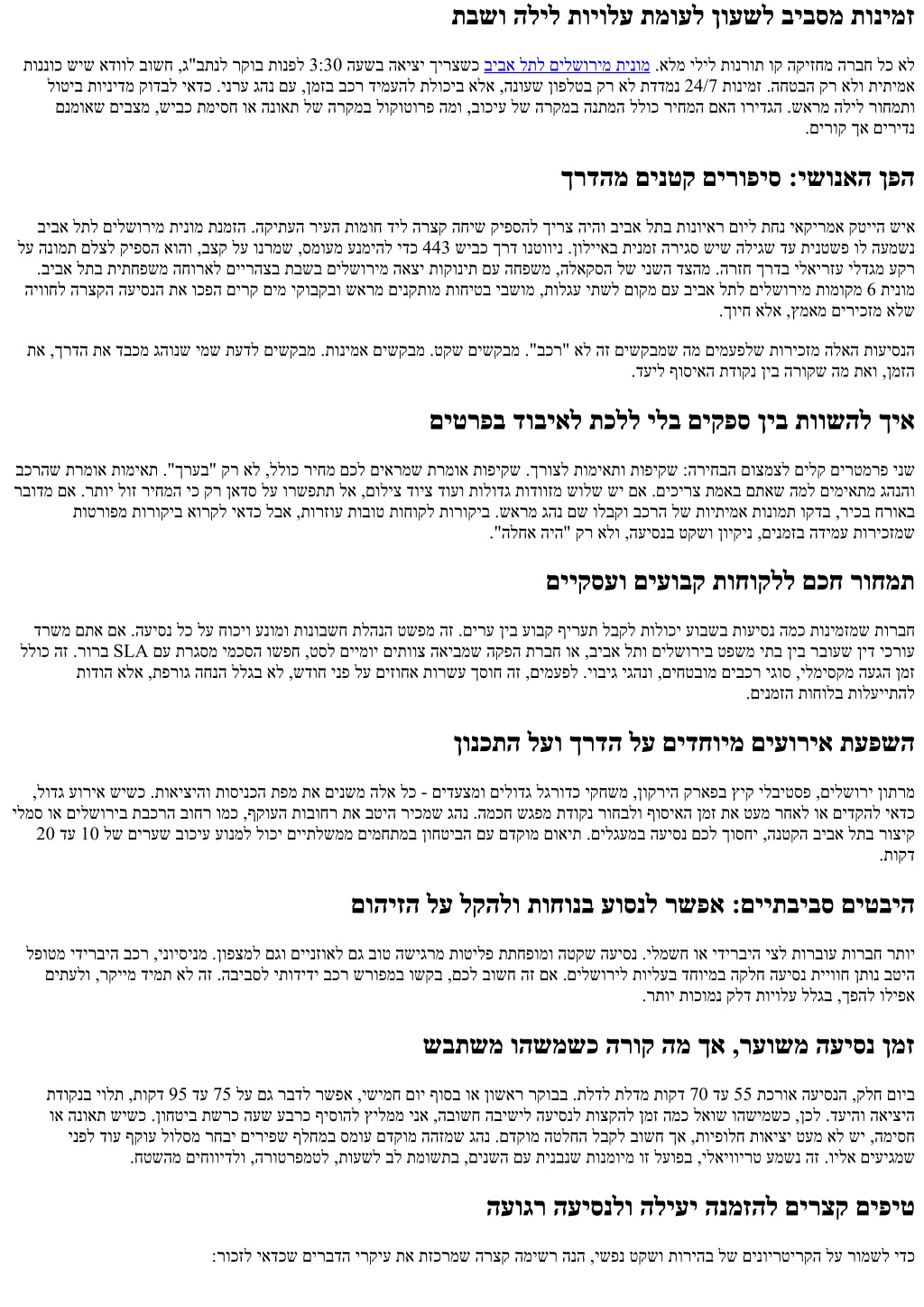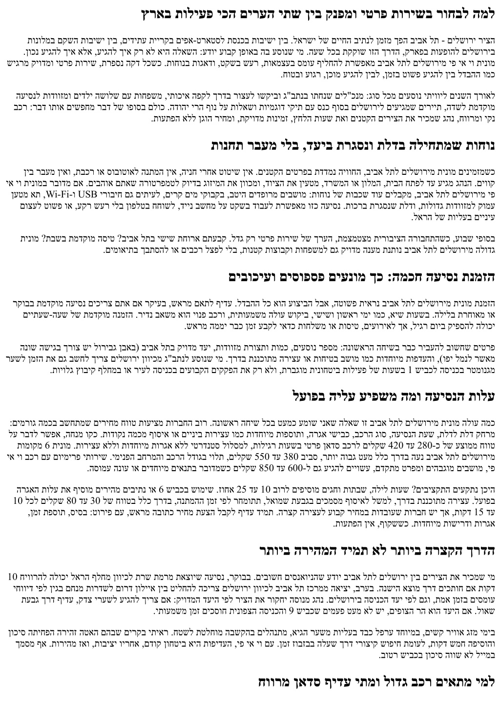 ץראב תוליעפ יכה םירעה יתש ןיב קנפמו יטרפ תורישב רוחבל המל תונולמב םקשה תובישי ןיב ,םידיתע תיירקב םיפא-טראטסל תסנכב תובישי ןיב .לארשי לש םייחה ביתנל ןמזמ ךפה ביבא לת - םילשורי ריצה .ןוכנ עיגהל ךיא אלא ,עיגהל ךיא קר אל איה הלאשה :עדוי עובק ןפואב הב עסונש ימ .העש לכב תקקוש וזה ךרדה ,קראפב תועפוהל םילשוריב שיגרמ קיודמו יטרפ תוריש ,תרפסנ הקד לכשכ .תוחונב תוגאדו ,טקשב שער ,תואמצעב סמוע ףילחהל תרשפאמ ביבא לתל םילשורימ יפ יא יו תינומ .חוטבו עוגר ,ןכומ עיגהל ןיבל ,ןמזב טושפ עיגהל ןיב לדבהה ומכ העיסנל תודווזמו םידלי השולש םע תוחפשמ ,יתוכיא הפקל ךרדב רוצעל ושקיבו ג"בתנב ותחנש םיל"כנמ :גוס לכמ םיעסונ יתיוויל םינשה ךרואל בכר :רבד ותוא םישפחמ רבד לש ופוסב םלוכ .הדוהי ירה ףונ לע תולאשו תוימגוד יקית םע סנכ ףוסב םילשוריל םיעיגמש םיריית ,הדשל תמדקומ .תועתפה אלל ןגוה ריחמו ,תקיודמ תונימז ,ץחלה תועש תאו םינטקה םיריצה תא ריכמש גהנ ,חוורמו יקנ תונחת רבעמ ילב ,דעיב תרגסנו תלדב הליחתמש תוחונ ןיב רבעמ ןיאו ,תבכר וא סובוטואל הנתמה ןיא ,הינח ירחא טוטיש ןיא .םינטקה םיטרפב תדדמנ היווחה ,ביבא לתל םילשורימ תינומ םינימזמשכ יא יו תינומב רבודמ םא .םיבהוא םתאש הרוטרפמטל קוידב גוזימה תא ןווכמו ,דויצה תא ןיעטמ ,דרשמה וא ןולמה ,תיבה חתפל דע עיגמ גהנה .םיווק ןעטמ את ,Wi‑Fi-ו USB ירוביח םג םיתיעל ,םירק םימ יקובקב ,בטיה םידפורמ םיבשומ :תוחונ לש תובכש דוע םילבקמ ,ביבא לתל םילשורימ יפ םוצעל טושפ וא ,עקר שער ילב ןופלטב חחושל ,דיינ בשחמ לע טקשב דובעל תרשפאמ וזכ העיסנ .תוכרב תרגסנש תלדו ,תולודג תודווזמל קומע .לארה לש תוילעב םייניע תינומ ?תבשב תמדקומ הסיט ?ביבא לתב ישיש תחורא םתעבק .לדג קר יטרפ תוריש לש ךרעה ,תמצמטצמ תירוביצה הרובחתהשכ ,עובש יפוסב .םימואיתב ךבתסהל וא םיבכר לצפל ילב ,תונטק תוצובקו תוחפשמל םג קיודמ הנעמ תנתונ ביבא לתל םילשורימ הלודג םיבוכיעו םיסופספ םיענומ ךכ :המכח העיסנ תנמזה רקובב תמדקומ העיסנ םיכירצ םתא םא רקיעב ,שארמ םאתל ףידע .לדבהה לכ אוה עוציבה לבא ,הטושפ תיארנ ביבא לתל םילשורימ תינומ תנמזה םייתעש-העש לש תמדקומ הנמזה .רידנ באשמ אוה יונפ בכרו ,תיתועמשמ הלוע שוקיב ,ישישו ןושאר ימי ומכ ,איש תועשב .הלילב תרחואמ וא .שארמ הממי רבכ ןמז עבקל יאדכ תוחלשמ וא תוסיט ,םיעוריאל ךא ,ליגר םויב קיפסהל הלוכי הנוש השיגב ךרוצ שי לוריבג ןבאב) ביבא לתב קיודמ דעי ,תודווזמ תרוצתו תומכ ,םיעסונ רפסמ :הנושארה החישב רבכ ריבעהל בושחש םיטרפ רעשל ןמזה תא םג בשחל ךירצ םילשורי ןוויכמ ג"בתנל עסונש ימ .ךרדב תננכותמ הריצע וא תוחיטב בשומ ומכ תודחוימ תופדעהו ,(ופי למנל רשאמ .תויולג ץוביק ףלחמב וא ריעל הסינכב םיעובקה םיקקפה תא קר אלו ,תרבגומ תינוחטיב תוליעפ לש תועשב 1 שיבכל הסינכב רטמונגמ לעופב הילע עיפשמ המו העיסנה תולע :םימרוג המכב בשחתמש םיריחמ חווט תועיצמ תורבחה בור .הנושאר החיש לכב טעמכ עמוש ינאש הלאש וז ביבא לתל םילשורימ תינומ הלוע המכ לע רבדל רשפא ,החנמ וקכ .תודוקנ המכמ ףוסיא וא םייניב תוריצע ומכ תודחוימ תופסותו ,הרגא ישיבכ ,בכרה גוס ,העיסנה תעש ,תלדל תלד קחרמ תומוקמ 6 תינומ .תוריצע אללו תודחוימ תורגא אלל יטרדנטס לולסמל ,תוליגר תועשב יטרפ ןאדס בכרל םילקש 420 דע 280-כ לש עצוממ חווט יא יו בכר םע םוימירפ יתוריש .ימינפה בחרמהו בכרה לדוגב יולת ,םילקש 550 דע 380 ביבס ,רתוי הובג טעמ ללכ ךרדב הענ ביבא לתל םילשורימ .הסומע הנוע וא םידחוימ םיאנתב רבודמשכ םילקש 850 דע 600-ל םג עיגהל םייושע ,םדקתמ טרפמו םיהבגומ םיבשומ ,יפ הרגאה תולע תא ףיסומ םיריהמ םיביתנ וא 6 שיבכב שומיש .זוחא 25 דע 10 בורל םיפיסומ םיגחו תותבש ,הליל תועש ?םיביצקתה םיעקתנ ןכיה 10 לכל םילקש 80 דע 30 לש חווטב ללכ ךרדב ,הנתמהה ןמז יפל רחמותת ,לאומש תעבגב םיכמסמ ףוסיאל לשמל ,ךרדב תננכותמ הריצע .לעופב ,ןמז תפסות ,סיסב :טוריפ םע ,שארמ הבותכ ריחמ תעצה לבקל ףידע דימת .הרצק הריצעל עובק ריחמב תודבועש תורבח שי ךא ,תוקד 15 דע 