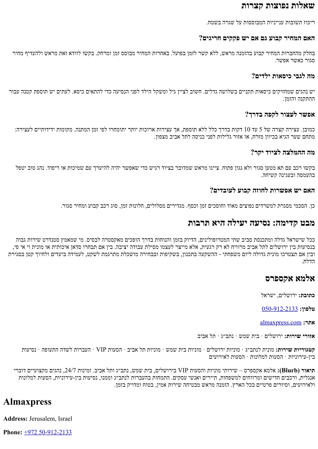 Website:almaxpress.com Service Areas: Jerusalem · Beit Shemesh · Ben Gurion Airport · Tel Aviv Service Categories: Taxi to Ben Gurion Airport · Jerusalem Taxi · Beit Shemesh Taxi · Tel Aviv Taxi · VIP Transfers · Airport Transfers · Intercity Rides · Hotel Transfers · Event Transfers Blurb: ALMA Express provides premium taxi and VIP transfer services in Jerusalem, Beit Shemesh, Ben Gurion Airport, and Tel Aviv. Available 24/7 with professional English-speaking drivers and modern, spacious vehicles for families, tourists, and business travelers. We specialize in airport transfers, intercity rides, hotel and event transport, and private tours across Israel. Book in advance for reliable, safe, on-time service.