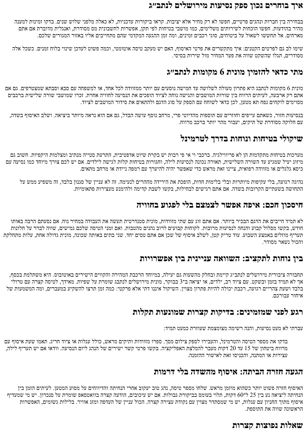 ג״בתנל םילשורימ תועיסנ קפס ןוכנ םירחוב ךיא הנעמל תונימז וקדב .םינש שולש ינפלמ הלאכ אל ,תוינכדע תורוקיב וארק .תוביצי אלא ריחמ קר אל ושפח ,םייטרפ םיגהנו תורבח ןיב הריחבב םתא םא תרבודמ תילגנאו ,תרדוסמ סמ תינובשחל תורשפא ,ןקת יפל תוחיטב יבשומ ומכ ,םימילשמ םיתורישל תוחכוה ושפח .תועדוהב ריהמ .םכלש םירוגמה רוזאב וילא םיבייחתמ םהש ימדקמה העגהה ןמז המו ,םינימז םיבכר יגוס ,םיחוטיב לע לואשל וששחת לא .םיחראמ הלא לכשכ .םינמז חולב יוניש ןכדעל טושפ המכו ,יטמוטוא הסיט בקעמ שי םאה ,ףוסיאה יטרפ תא םירשקתמ ךיא :םינטקה םיטרפל םג בל ומיש .יסיסב תוריש לומ ריחמה רעפ תא הווש טקשהש ולגת ,םירדוסמ ג״בתנל תומוקמ 6 תינומ ןימזהל יאדכ יתמ םא םג .םיפרטצמש אתבסו אבס םע החפשמל וא ,דחא לכל הדווזממ רתוי םע םיעסונ השימח דע השולשל הלועמ ןורתפ איה גבתנל תומוקמ 6 תינומ םיבכרב תישילש הרוש יבשומש ורכז .תרחא היווחל העיסנה תא םיכפוה דויצל החונ השיגהו םיבשומה תורוש ןיב חוורה םיתיעל ,העברא קר םתא .דויצל םיבשומה רודיס תא םיאתהלו םגדה גוס לע קפסה םע חחושל יאדכ ןכל ,ןעטמ את חפנ םיחקול םימיוסמ ,הדשב ףוסיאה בלשו .האיציב רתוימ הארנ אוה םא םג ,לדבה השוע ףסונ בחרמ ,ירפ יטוידהמ תופסות םע םירזוחו םיפייע םתאשכ ,רוזח תועיסנב .חוורמ בכרב רתוי רהמ רובעי ,םיקית לש תרדוסמ הקולח םע לנימרטל ךרדב תוחונו תוחיטב ילוקיש םג בושח .תויפקיה תומלצמו ביתנמ הייטס תערתה ,תיביטפדא טויש תרקב שי תובר יפ יא יו יבכרב .היגליווירפ אל ןה תומדקתמ תוחיטב תוכרעמ םע העיסנ ומכ דחוימ ךרוצ םכל שי םא .םידליל השיגל תולק תוחיטב תורוגחו ,הליל תועיסנל הנוכנ הרואת ,תישילשה הרושה דע עיגמש ליעי גוזימ .םיאתמ בחרמ וא תדיינ הפמר םע ךרעיהל היהי רשפאש ידכ שארמ תאז ונייצ ,תיאופר הדווזמ וא םילגלג אסיכ לע שממ עיפשמ הז ,דבלב ןונגס לש ןיינע אל הז .המיענל םירההמ הדיריה תא תכפוה ,תודח תומילב ילבו תורתוימ תופיקע ילב ,העוגר הגיהנ .תוימואתפ תוריצעמ ענמיהלו המידק תבשל ושקב ,תוליחבל םישיגר םתא םא .הדשב תובורקה םייתעשב השוחתה היווחב עוגפל ילב םצמצל רשפא הפיא :םכח ןוכסיח ותואב הברה םתעסנ םא .חונ ריחמב הדובעה תא השעת תיטרדנטס תינומ ,תודווזמ יתש םע גוז םתא םא .רתויב ריכבה םגדה תא םיבייח דימת אל תונולח לע ררבל הווש ,םישימג םכלש הסיטה ינמז םאו .תובטהמ םינהנ בורל םיעובק תוחוקל .תובורמ תועיסנל החנהו עובק לולסמ ושקב ,שדוח תקלחתמ תולע ,תחא הלודג תינומ ,הנוכש התואב םיתב ינש .דחי םיסט םתא םא ןכש לש ףוסיא בלשל ,ןטק קירט דוע .עובשה עצמאב םילזומ ףירעת .רדוסמ ראשנ לוכהו תויורשפא ןיב תיניינע האוושה :ביצקתל תוחונ ןיב ,ףסכב תמלתשמ איה .סובוטואב םירישיה םיווקהו הריהמה תבכרה דחוימב ,הליעי םג תועשהמ קלחבו תמייק ג״בתנל םילשורימ תירוביצ הרובחת ילורט םע הרצק הסיטל ,ךדיאמ .תויפש לע תרמוש גבתנל םילשורימ תינומ ,רקובב 3־ב האיצי וא ,םידלי ,בר דויצ םע .טקשבו ןמזב דימת אל ךא לש תועמשמה המו ,םירבעמב עיקשהל וצרת ןמז המכ :יטקרפ אלא יתד ונניא לוקישה .ןיוצמ ןורתפ תויהל הלוכי תבכר ,העוגר םיירהצ תעשו דבלב .םכרובע רוחיא תולקת תוענומש תורצק תוקידב :םינימזמש ינפל עגר :דימת טעמכ תרזועש תמצמוצמ המישר הנהו ,תועיסנ טעמ אל יתרבע םע ףוסיא תעש ומאת .גירח דויצ וא תולגע ללוכ ,שארמ םיקיתו תודווזמ ורפס .ךסמ םוליצ קפסל וריבעהו ,לנימרטהו הסיטה רפסמ תא וקדב ,הליל ףירעת שי םא ואדוו .העיסנה םויל גהנה לש םירישי רשק יטרפ ושקב .היצקילפאה תצלמהל רבעמ תוקד 20 דע 15 לש ןוחטיב חוורמ .הנמזהה רושיאל תאז וסינכהו ,הנתמה וא תוריצע תומרד ילב הדשהמ ףוסיא :התיבה הרזח העגה ןיב ןמזה םיתיעל .ןעטמה עוסמ לע םיחווידהו התיחנה ירחא בוקעי בוט גהנ ,הסיט רפסמ וחלש .שארמ ןמזומ אוהשכ רתוי טושפ הרזח ףוסיאה ףידעמש ימ שי .ןורכנס לע תרמוש פאסטאווב הרצק העדוה ,םיבוכיע שי םא .תולובג תרוקיבב סמועב יולת ,תוקד 60־ל 25 ןיב ענ האיציל התיחנה תורשפאה ,םימושג תולילב .ריווא גזמו הפדעה לש ןיינע לוכה .ה
