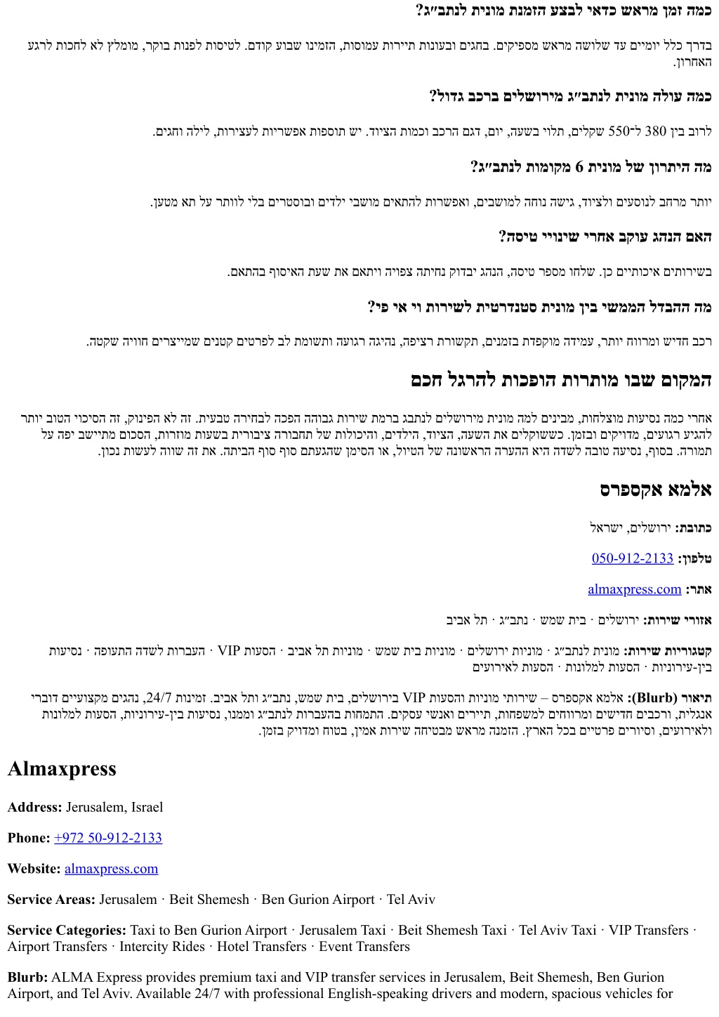 ?ג״בתנל תינומ תנמזה עצבל יאדכ שארמ ןמז המכ עגרל תוכחל אל ץלמומ ,רקוב תונפל תוסיטל .םדוק עובש ונימזה ,תוסומע תוריית תונועבו םיגחב .םיקיפסמ שארמ השולש דע םיימוי ללכ ךרדב .ןורחאה ?לודג בכרב םילשורימ ג״בתנל תינומ הלוע המכ .םיגחו הליל ,תוריצעל תוירשפא תופסות שי .דויצה תומכו בכרה םגד ,םוי ,העשב יולת ,םילקש 550־ל 380 ןיב בורל ?ג״בתנל תומוקמ 6 תינומ לש ןורתיה המ .ןעטמ את לע רתוול ילב םירטסובו םידלי יבשומ םיאתהל תורשפאו ,םיבשומל החונ השיג ,דויצלו םיעסונל בחרמ רתוי ?הסיט ייוניש ירחא בקוע גהנה םאה .םאתהב ףוסיאה תעש תא םאתיו היופצ התיחנ קודבי גהנה ,הסיט רפסמ וחלש .ןכ םייתוכיא םיתורישב ?יפ יא יו תורישל תיטרדנטס תינומ ןיב ישממה לדבהה המ .הטקש היווח םירציימש םינטק םיטרפל בל תמושתו העוגר הגיהנ ,הפיצר תרושקת ,םינמזב תדפקומ הדימע ,רתוי חוורמו שידח בכר םכח לגרהל תוכפוה תורתומ ובש םוקמה רתוי בוטה יוכיסה הז ,קוניפה אל הז .תיעבט הריחבל הכפה ההובג תוריש תמרב גבתנל םילשורימ תינומ המל םיניבמ ,תוחלצומ תועיסנ המכ ירחא לע הפי בשייתמ םוכסה ,תורזומ תועשב תירוביצ הרובחת לש תולוכיהו ,םידליה ,דויצה ,העשה תא םילקוששכ .ןמזבו םיקיודמ ,םיעוגר עיגהל .ןוכנ תושעל הווש הז תא .התיבה ףוס ףוס םתעגהש ןמיסה וא ,לויטה לש הנושארה הרעהה איה הדשל הבוט העיסנ ,ףוסב .הרומת סרפסקא אמלא לארשי ,םילשורי :תבותכ 050-912-2133:ןופלט almaxpress.com:רתא ביבא לת · ג״בתנ · שמש תיב · םילשורי :תוריש ירוזא תועיסנ · הפועתה הדשל תורבעה · VIP תועסה · ביבא לת תוינומ · שמש תיב תוינומ · םילשורי תוינומ · ג״בתנל תינומ :תוריש תוירוגטק םיעוריאל תועסה · תונולמל תועסה · תוינוריע-ןיב ירבוד םייעוצקמ םיגהנ ,24/7 תונימז .ביבא לתו ג״בתנ ,שמש תיב ,םילשוריב VIP תועסהו תוינומ יתוריש – סרפסקא אמלא :(Blurb) רואית תונולמל תועסה ,תוינוריע-ןיב תועיסנ ,ונממו ג״בתנל תורבעהב תוחמתה .םיקסע ישנאו םיריית ,תוחפשמל םיחוורמו םישידח םיבכרו ,תילגנא .ןמזב קיודמו חוטב ,ןימא תוריש החיטבמ שארמ הנמזה .ץראה לכב םייטרפ םירויסו ,םיעוריאלו Almaxpress Address: Jerusalem, Israel Phone:+972 50-912-2133 Website:almaxpress.com Service Areas: Jerusalem · Beit Shemesh · Ben Gurion Airport · Tel Aviv Service Categories: Taxi to Ben Gurion Airport · Jerusalem Taxi · Beit Shemesh Taxi · Tel Aviv Taxi · VIP Transfers · Airport Transfers · Intercity Rides · Hotel Transfers · Event Transfers Blurb: ALMA Express provides premium taxi and VIP transfer services in Jerusalem, Beit Shemesh, Ben Gurion Airport, and Tel Aviv. Available 24/7 with professional English-speaking drivers and modern, spacious vehicles for
