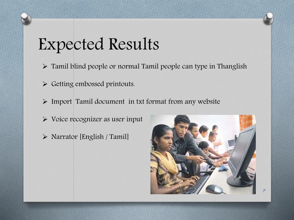Expected Results • Tamil blind people or normal Tamil people can type in Thanglish • Getting embossed printouts. • Import Tamil document in txt format from any website • Voice recognizer as user input • Narrator [English / Tamil]