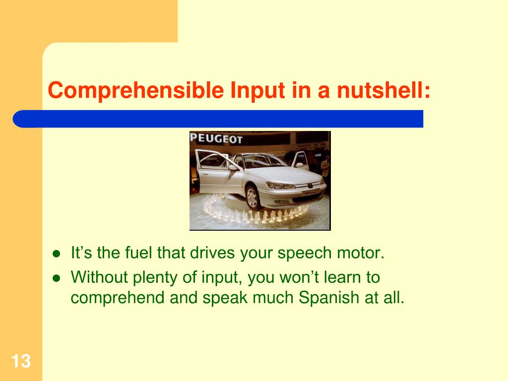 Comprehensible Input in a nutshell: • It’s the fuel that drives your speech motor. • Without plenty of input, you won’t learn to comprehend and speak much Spanish at all. 13