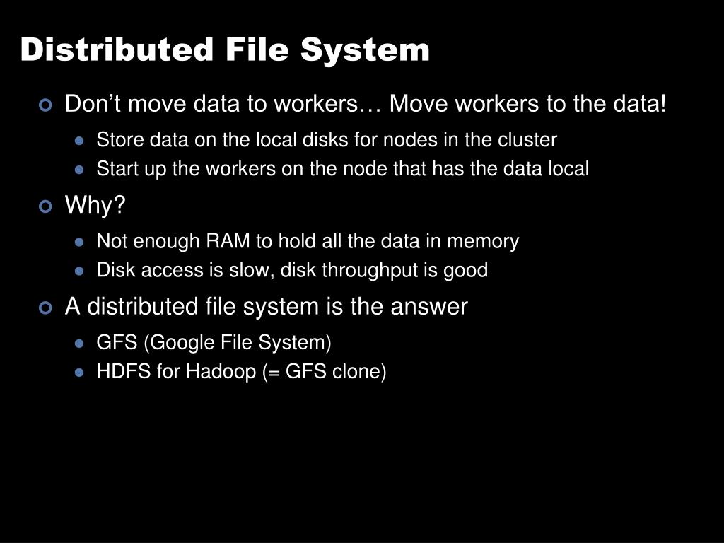 Distributed File System • Don’t move data to workers… Move workers to the data! • Store data on the local disks for nodes in the cluster • Start up the workers on the node that has the data local • Why? • Not enough RAM to hold all the data in memory • Disk access is slow, disk throughput is good • A distributed file system is the answer • GFS (Google File System) • HDFS for Hadoop (= GFS clone)
