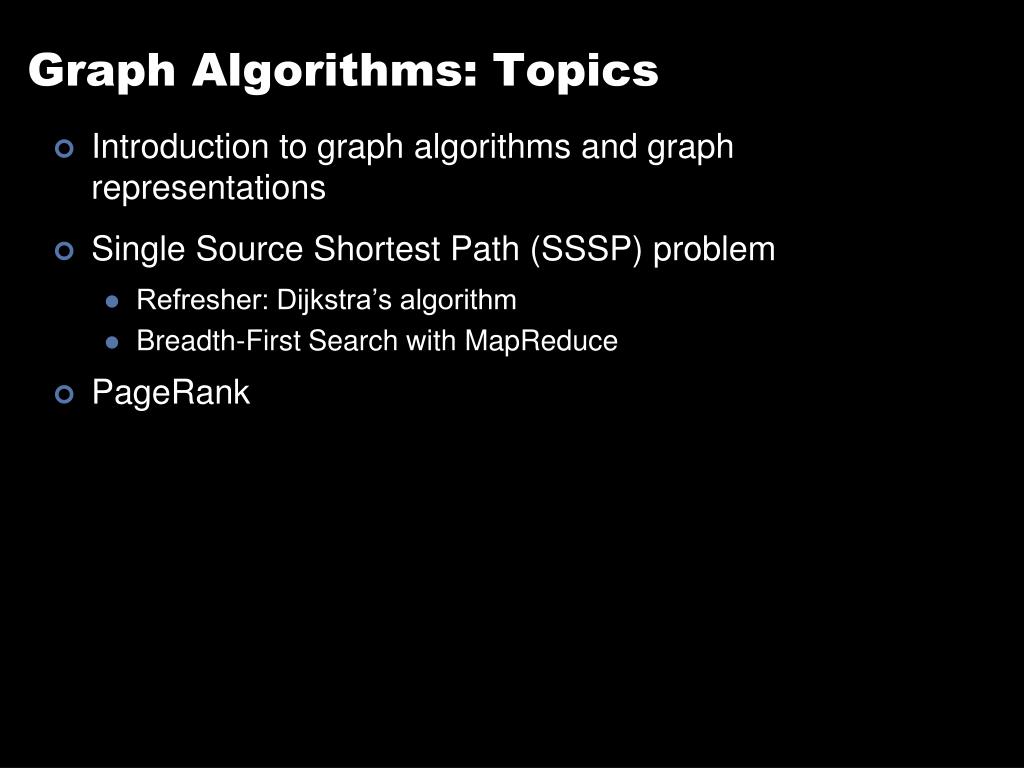 Graph Algorithms: Topics • Introduction to graph algorithms and graph representations • Single Source Shortest Path (SSSP) problem • Refresher: Dijkstra’s algorithm • Breadth-First Search with MapReduce • PageRank