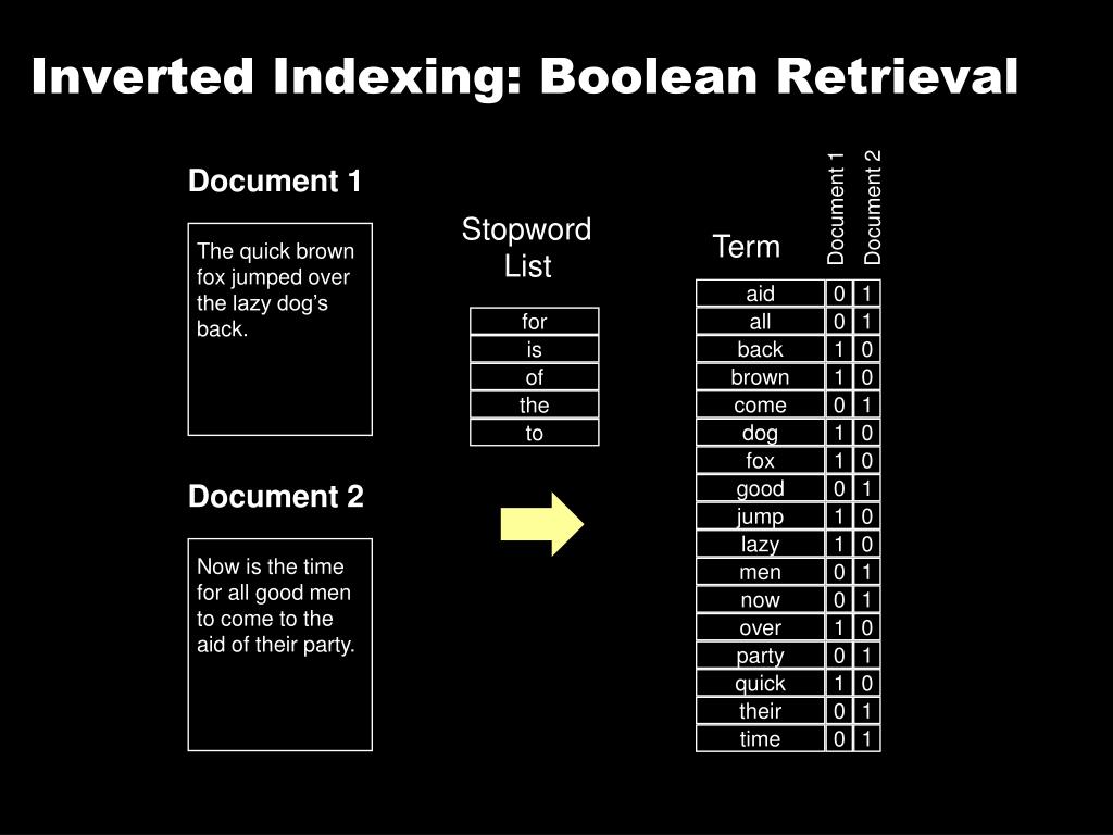 aid 0 1 all 0 1 back 1 0 brown 1 0 come 0 1 dog 1 0 fox 1 0 good 0 1 jump 1 0 lazy 1 0 men 0 1 now 0 1 over 1 0 party 0 1 quick 1 0 their 0 1 time 0 1 Inverted Indexing: Boolean Retrieval Document 1 Term Document 1 Document 2 Stopword List The quick brown fox jumped over the lazy dog’s back. for is of the to Document 2 Now is the time for all good men to come to the aid of their party.