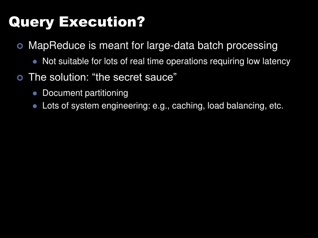 Query Execution? • MapReduce is meant for large-data batch processing • Not suitable for lots of real time operations requiring low latency • The solution: “the secret sauce” • Document partitioning • Lots of system engineering: e.g., caching, load balancing, etc.
