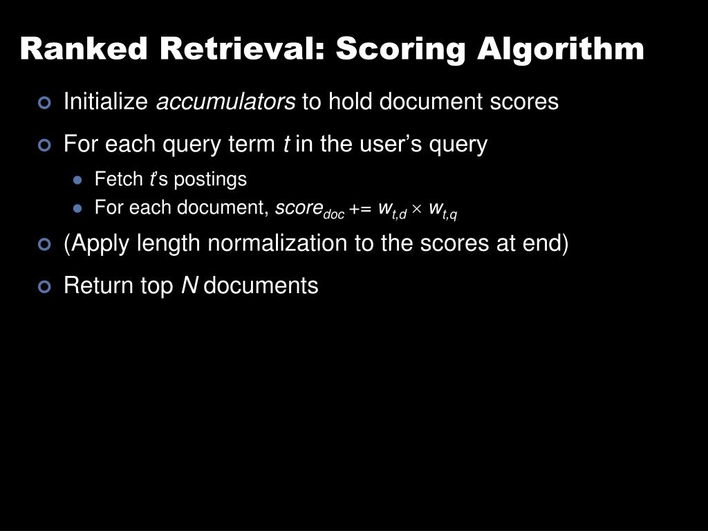 Ranked Retrieval: Scoring Algorithm • Initialize accumulators to hold document scores • For each query term t in the user’s query • Fetch t’s postings • For each document, scoredoc += wt,d wt,q • (Apply length normalization to the scores at end) • Return top N documents