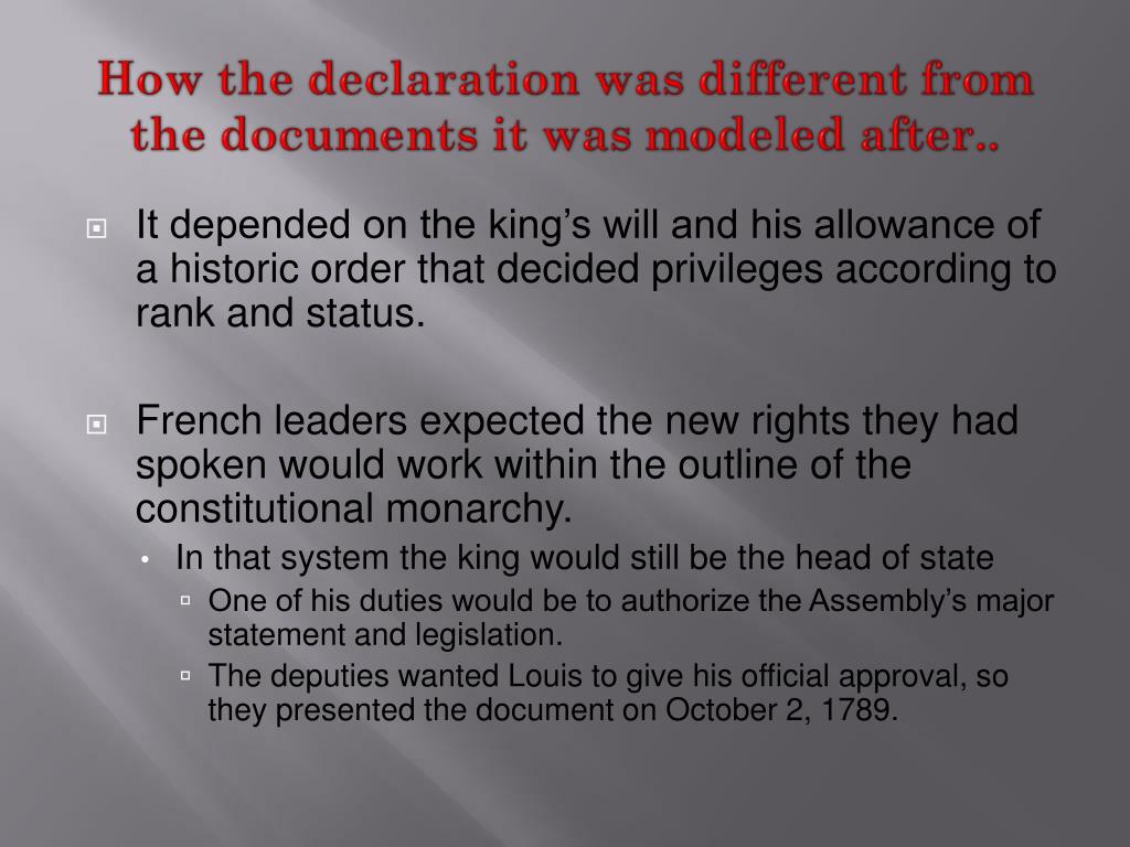 How the declaration was different from the documents it was modeled after.. • It depended on the king’s will and his allowance of a historic order that decided privileges according to rank and status. • French leaders expected the new rights they had spoken would work within the outline of the constitutional monarchy. • In that system the king would still be the head of state • One of his duties would be to authorize the Assembly’s major statement and legislation. • The deputies wanted Louis to give his official approval, so they presented the document on October 2, 1789.