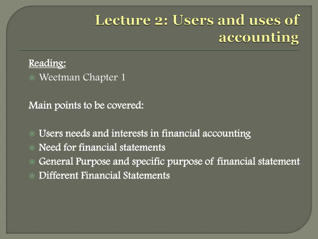 Lecture 2: Users and uses of accounting Reading: • Weetman Chapter 1 Main points to be covered: • Users needs and interests in financial accounting • Need for financial statements • General Purpose and specific purpose of financial statement • Different Financial Statements