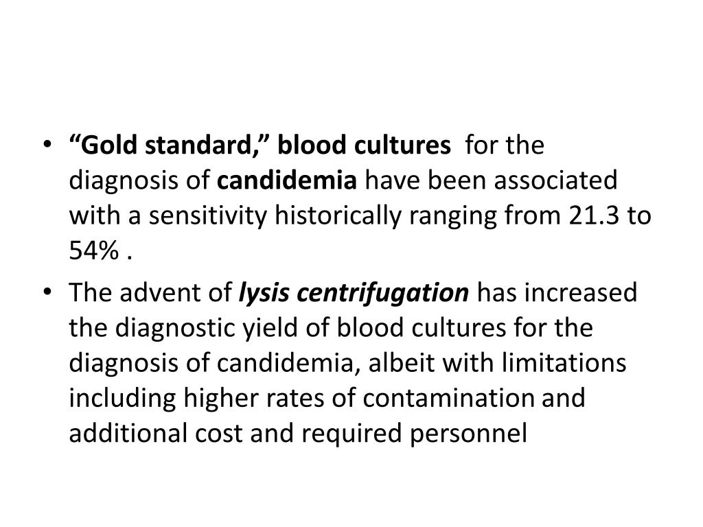 “Gold standard,” blood cultures for the diagnosis of candidemia have been associated with a sensitivity historically ranging from 21.3 to 54% . • The advent of lysis centrifugation has increased the diagnostic yield of blood cultures for the diagnosis of candidemia, albeit with limitations including higher rates of contamination and additional cost and required personnel