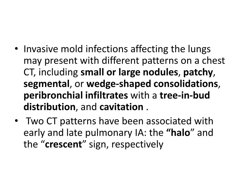 Invasive mold infections affecting the lungs may present with different patterns on a chest CT, including small or large nodules, patchy, segmental, or wedge-shaped consolidations, peribronchialinfiltrates with a tree-in-bud distribution, and cavitation . • Two CT patterns have been associated with early and late pulmonary IA: the “halo” and the “crescent” sign, respectively