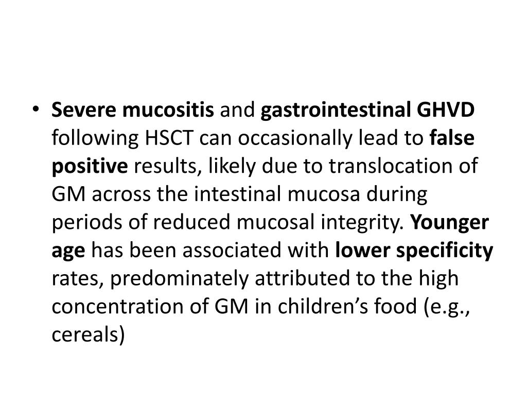Severe mucositisand gastrointestinal GHVD following HSCT can occasionally lead to falsepositive results, likely due to translocation of GM across the intestinal mucosa during periods of reduced mucosal integrity. Youngerage has been associated with lower specificity rates, predominately attributed to the high concentration of GM in children’s food (e.g., cereals)