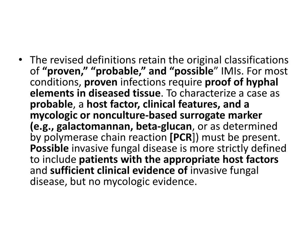 The revised definitions retain the original classifications of “proven,” “probable,” and “possible” IMIs. For most conditions, proven infections require proof of hyphal elements in diseased tissue. To characterize a case as probable, a host factor, clinical features, and a mycologic or nonculture-based surrogate marker (e.g., galactomannan, beta-glucan, or as determined by polymerase chain reaction [PCR]) must be present. Possible invasive fungal disease is more strictly defined to include patients with the appropriate host factors and sufficient clinical evidence of invasive fungal disease, but no mycologic evidence.