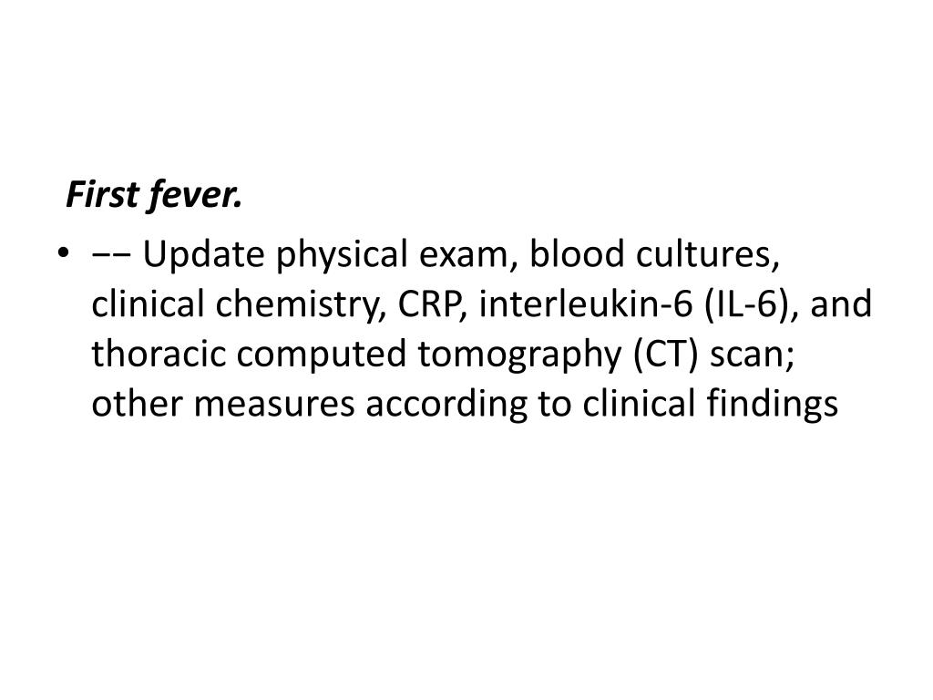 First fever. • −− Update physical exam, blood cultures, clinical chemistry, CRP, interleukin-6 (IL-6), and thoracic computed tomography (CT) scan; other measures according to clinical findings