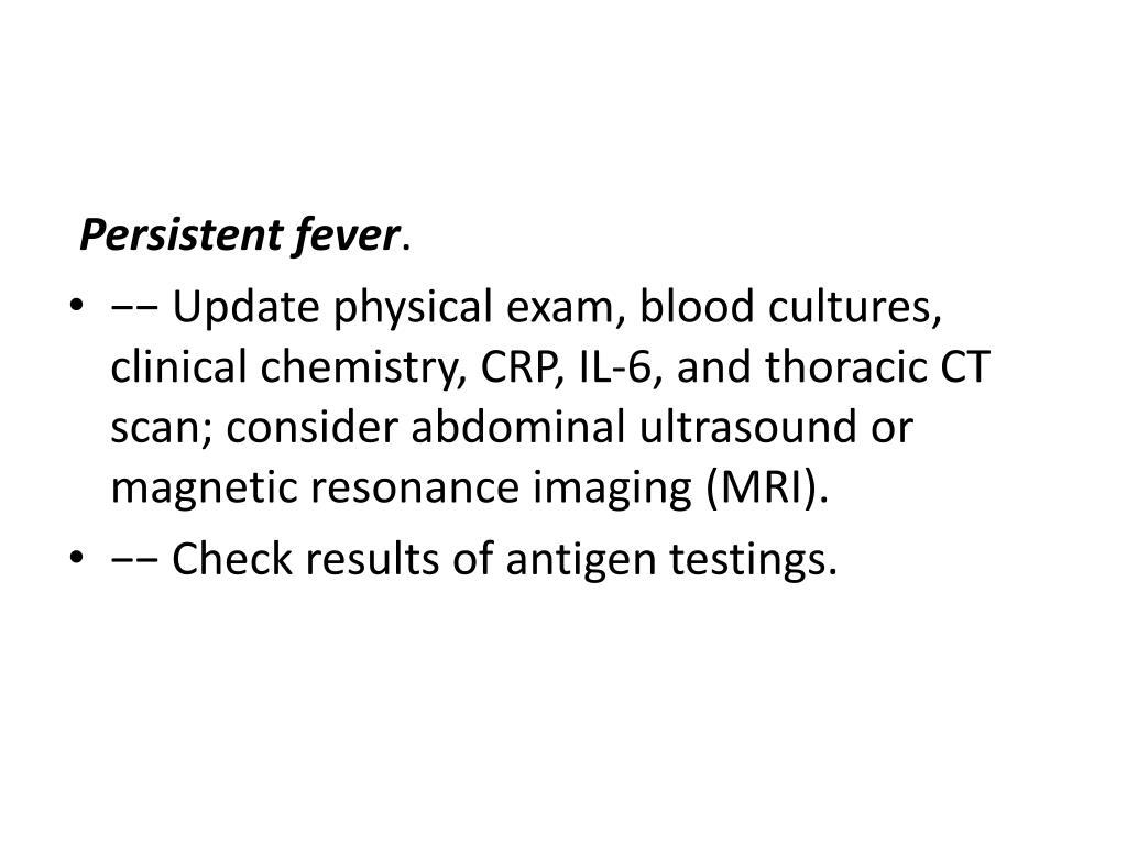 Persistent fever. • −− Update physical exam, blood cultures, clinical chemistry, CRP, IL-6, and thoracic CT scan; consider abdominal ultrasound or magnetic resonance imaging (MRI). • −− Check results of antigen testings.