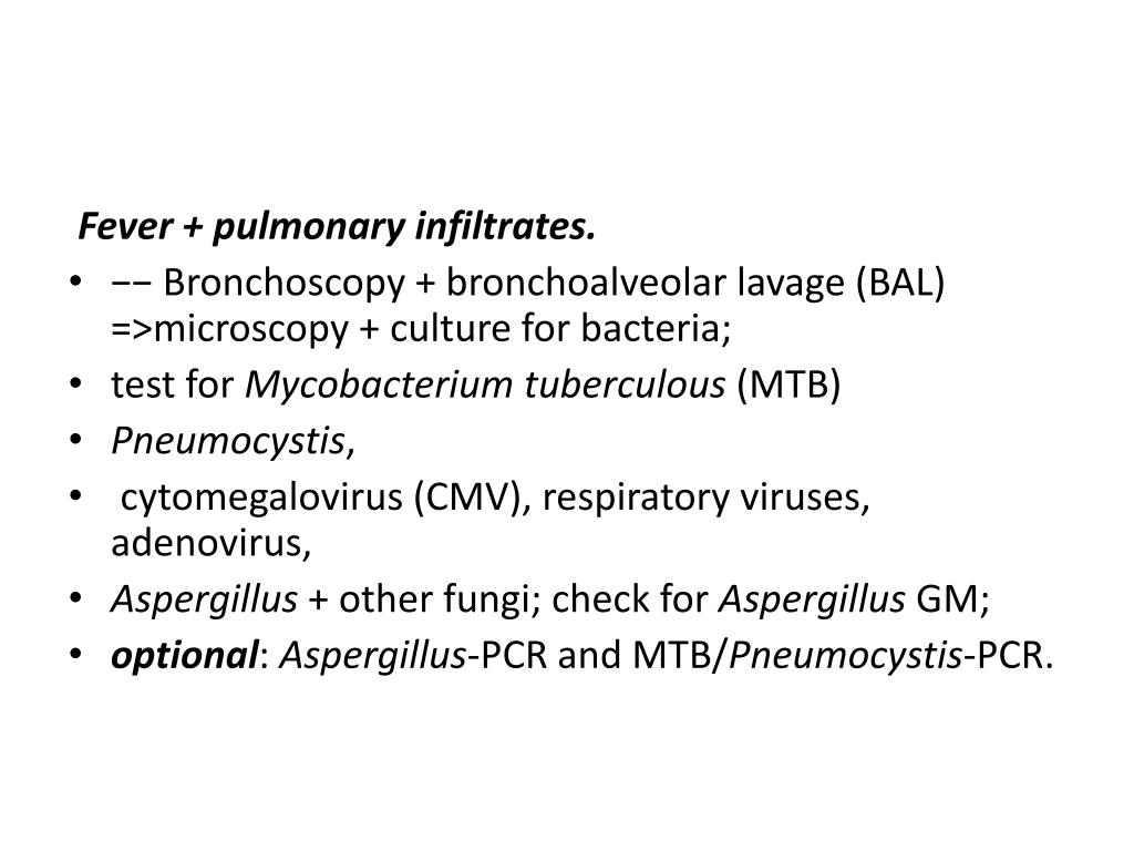 Fever + pulmonary infiltrates. • −− Bronchoscopy + bronchoalveolar lavage (BAL) =>microscopy + culture for bacteria; • test for Mycobacterium tuberculous(MTB) • Pneumocystis, • cytomegalovirus (CMV), respiratory viruses, adenovirus, • Aspergillus+ other fungi; check for AspergillusGM; • optional: Aspergillus-PCR and MTB/Pneumocystis-PCR.