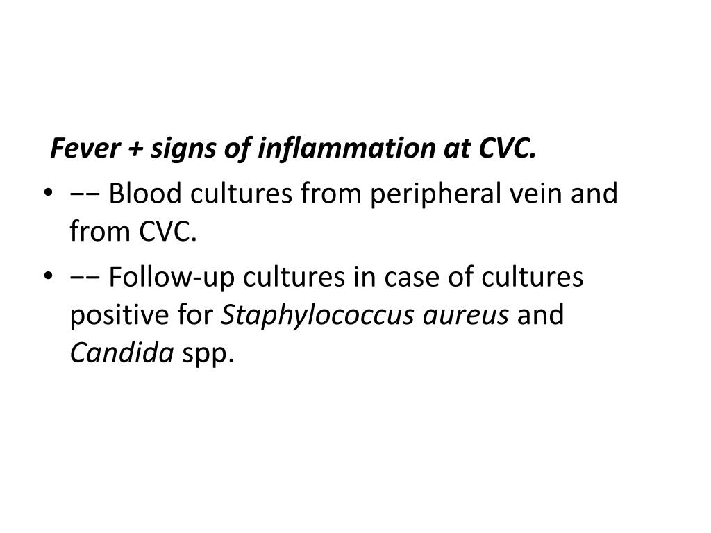 Fever + signs of inflammation at CVC. • −− Blood cultures from peripheral vein and from CVC. • −− Follow-up cultures in case of cultures positive for Staphylococcus aureusand Candida spp.