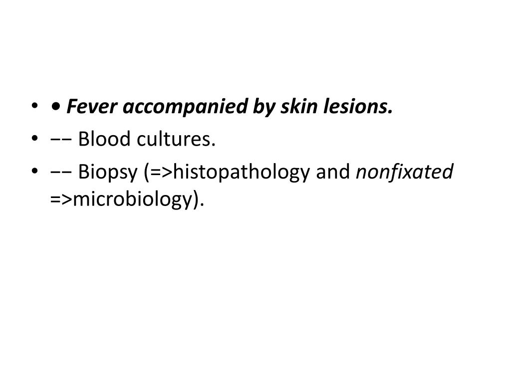 • Fever accompanied by skin lesions. • −− Blood cultures. • −− Biopsy (=>histopathology and nonfixated=>microbiology).