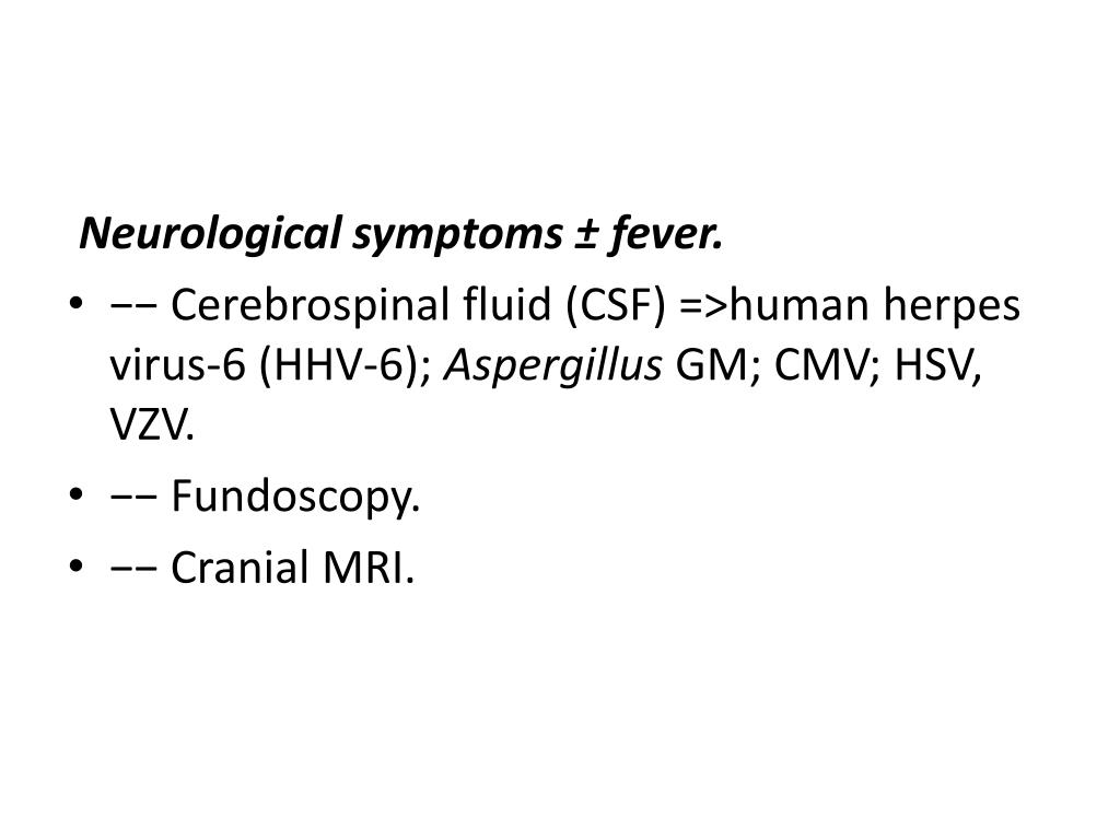 Neurological symptoms ± fever. • −− Cerebrospinal fluid (CSF) =>human herpes virus-6 (HHV-6); AspergillusGM; CMV; HSV, VZV. • −− Fundoscopy. • −− Cranial MRI.