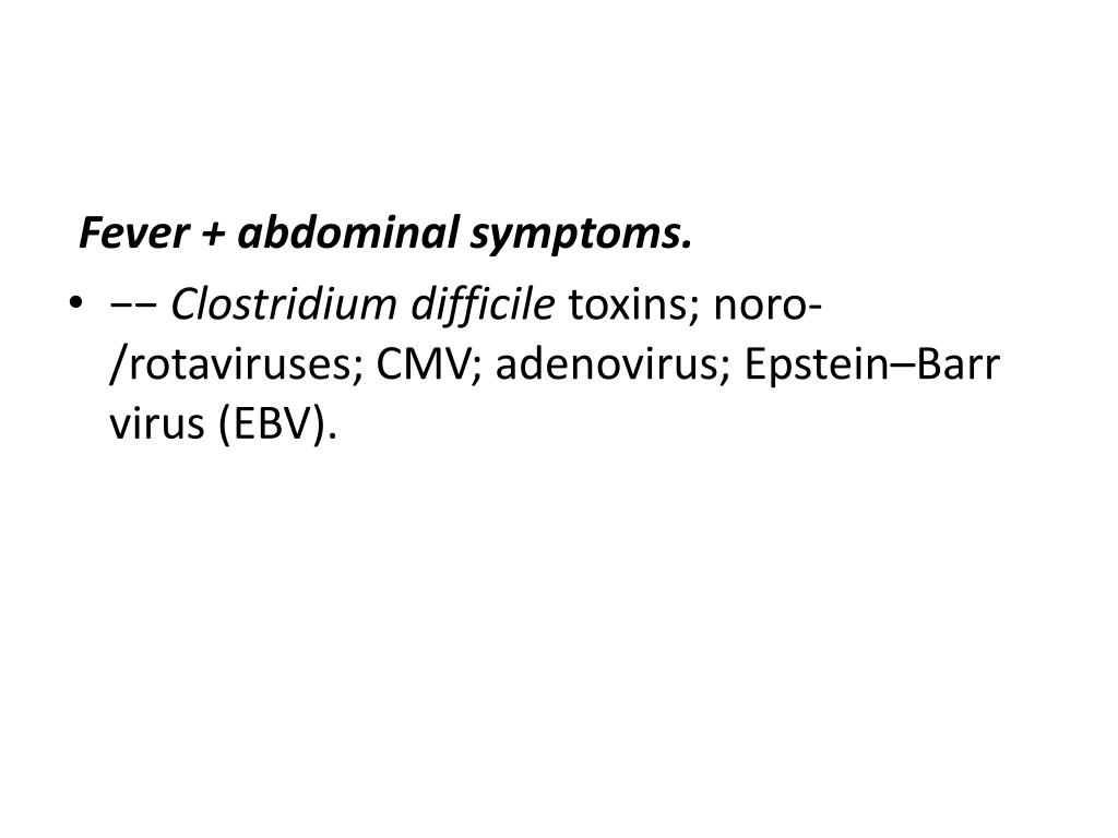 Fever + abdominal symptoms. • −− Clostridium difficiletoxins; noro-/rotaviruses; CMV; adenovirus; Epstein–Barr virus (EBV).