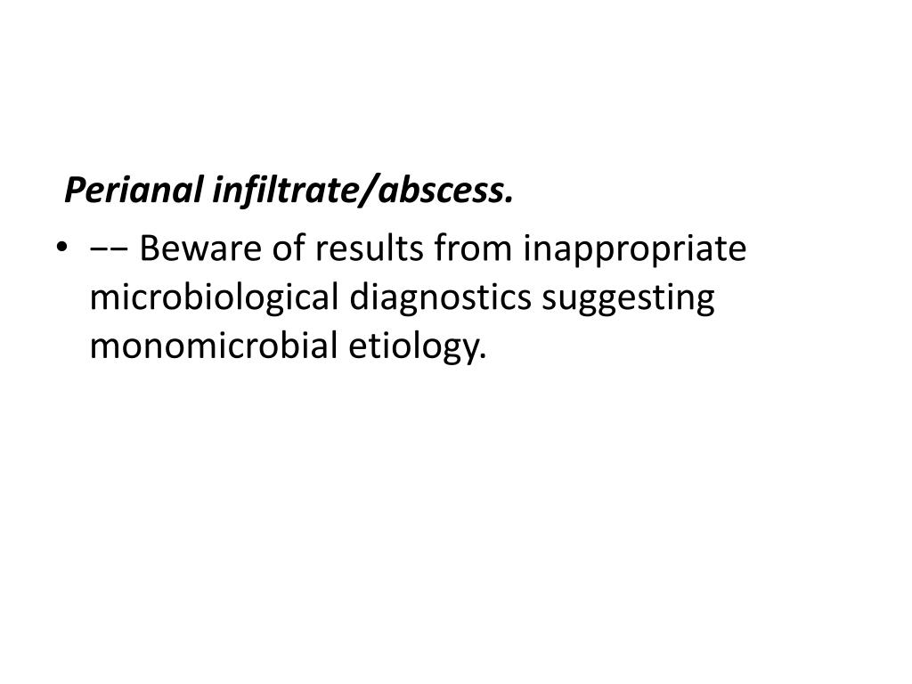 Perianal infiltrate/abscess. • −− Beware of results from inappropriate microbiological diagnostics suggesting monomicrobial etiology.