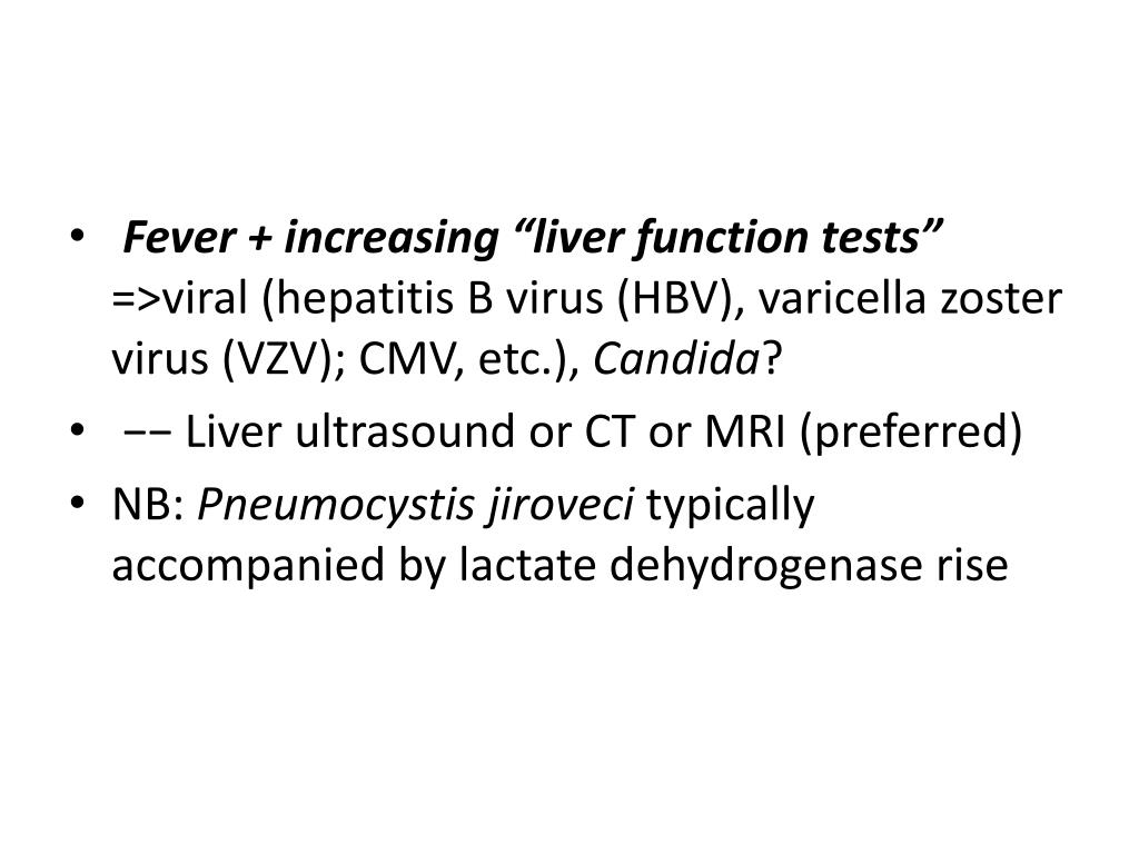 Fever + increasing “liver function tests” =>viral (hepatitis B virus (HBV), varicella zoster virus (VZV); CMV, etc.), Candida? • −− Liver ultrasound or CT or MRI (preferred) • NB: Pneumocystis jirovecitypically accompanied by lactate dehydrogenase rise