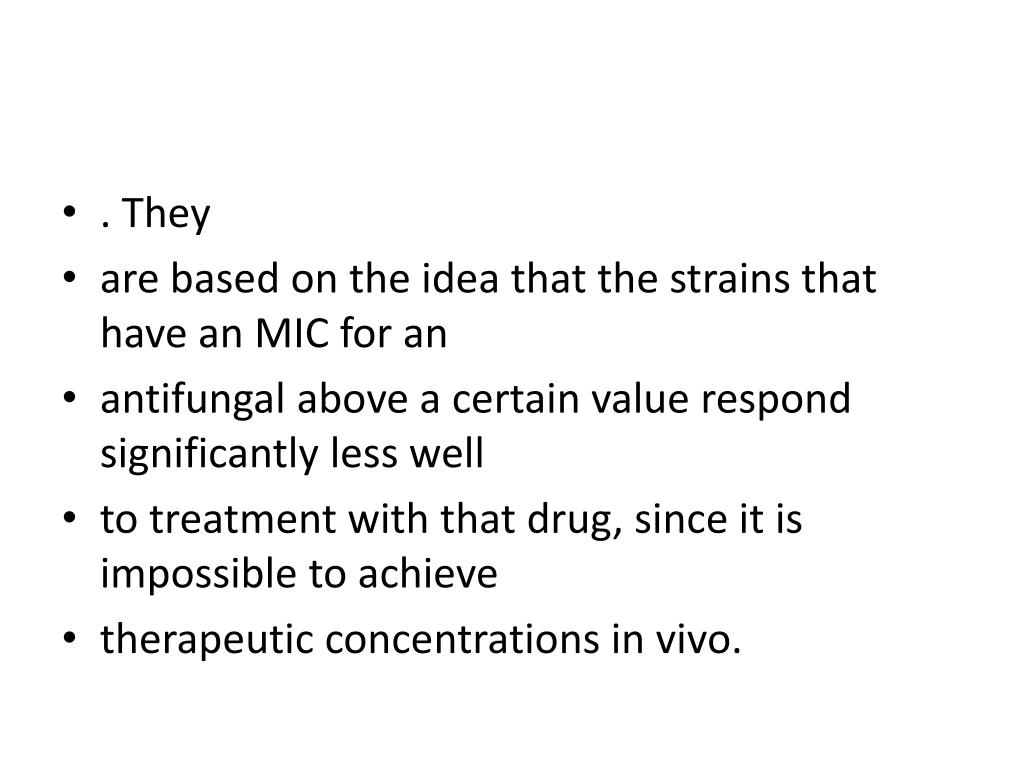 . They • are based on the idea that the strains that have an MIC for an • antifungal above a certain value respond significantly less well • to treatment with that drug, since it is impossible to achieve • therapeutic concentrations in vivo.