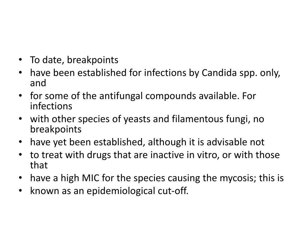 To date, breakpoints • have been established for infections by Candida spp. only, and • for some of the antifungal compounds available. For infections • with other species of yeasts and filamentous fungi, no breakpoints • have yet been established, although it is advisable not • to treat with drugs that are inactive in vitro, or with those that • have a high MIC for the species causing the mycosis; this is • known as an epidemiological cut-off.