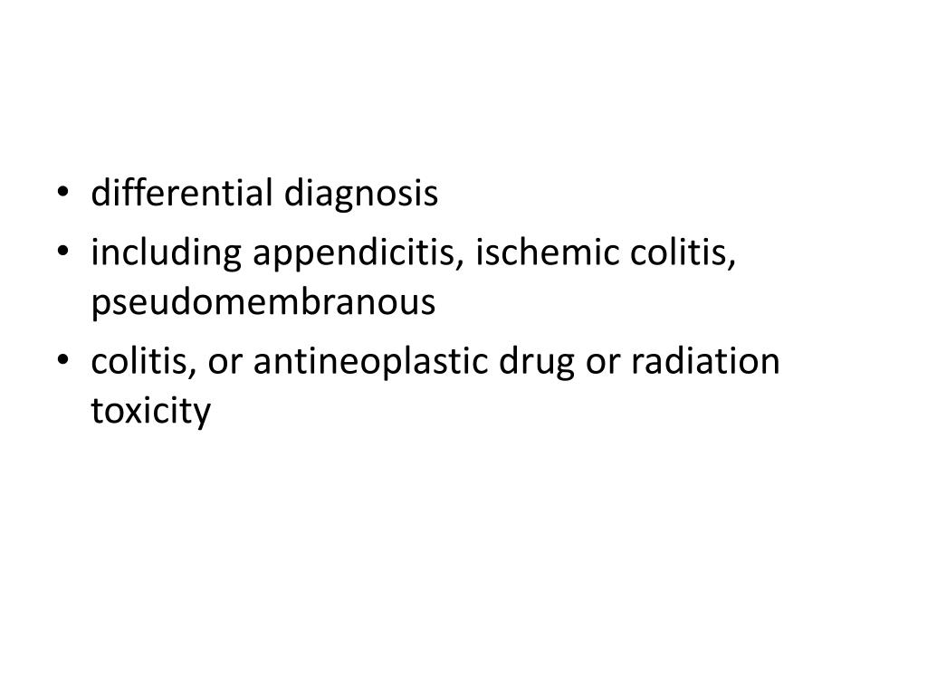 differential diagnosis • including appendicitis, ischemic colitis, pseudomembranous • colitis, or antineoplastic drug or radiation toxicity