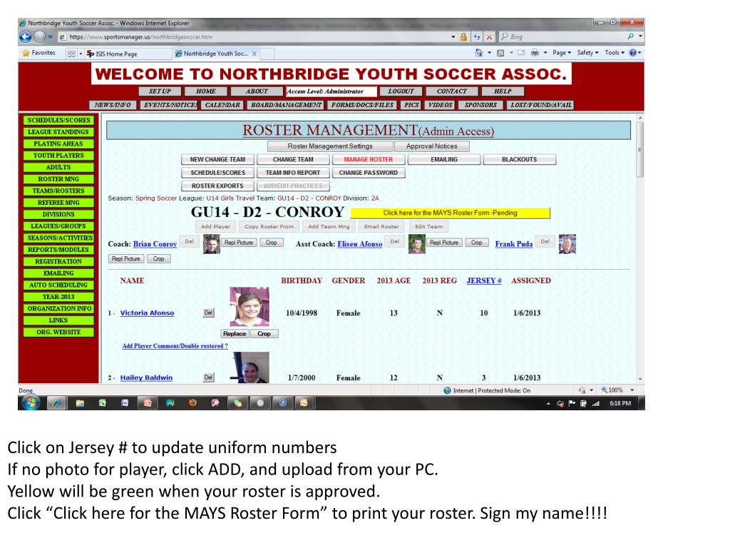 Click on Jersey # to update uniform numbers If no photo for player, click ADD, and upload from your PC. Yellow will be green when your roster is approved. Click “Click here for the MAYS Roster Form” to print your roster. Sign my name!!!!