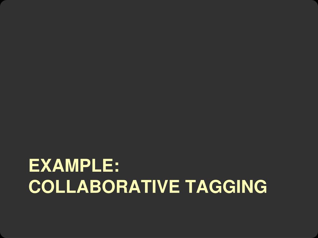 Forms of Tagging (Golder ‘05) • Identifying what (or who) it is about. (topics) • Identifying what it is. (“blog”, “book”, “video”) • Identifying who owns it. • Refining categories. • Identifying qualities or characteristics. (“funny”) • Self reference.(“mystuff”) • Task organizing. (“toread”)