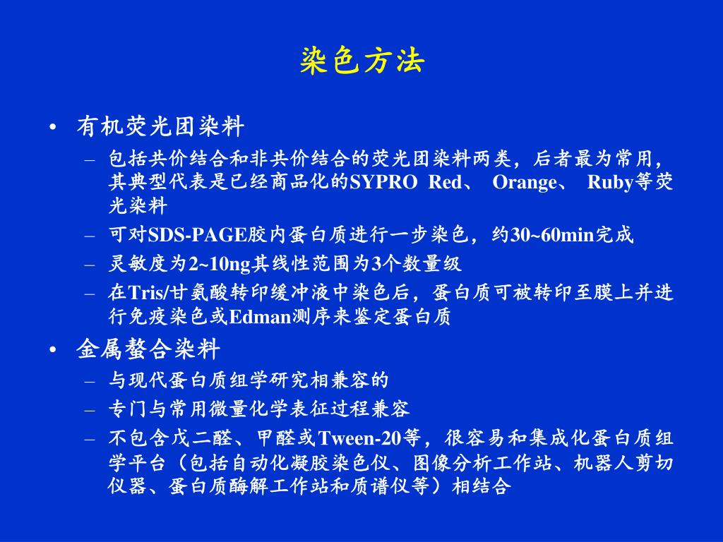 染色方法 • 有机荧光团染料 • 包括共价结合和非共价结合的荧光团染料两类,后者最为常用,其典型代表是已经商品化的SYPRO Red、 Orange、 Ruby等荧光染料 • 可对SDS-PAGE胶内蛋白质进行一步染色,约30~60min完成 • 灵敏度为2~10ng其线性范围为3个数量级 • 在Tris/甘氨酸转印缓冲液中染色后,蛋白质可被转印至膜上并进行免疫染色或Edman测序来鉴定蛋白质 • 金属螯合染料 • 与现代蛋白质组学研究相兼容的 • 专门与常用微量化学表征过程兼容 • 不包含戊二醛、甲醛或Tween-20等,很容易和集成化蛋白质组学平台(包括自动化凝胶染色仪、图像分析工作站、机器人剪切仪器、蛋白质酶解工作站和质谱仪等)相结合