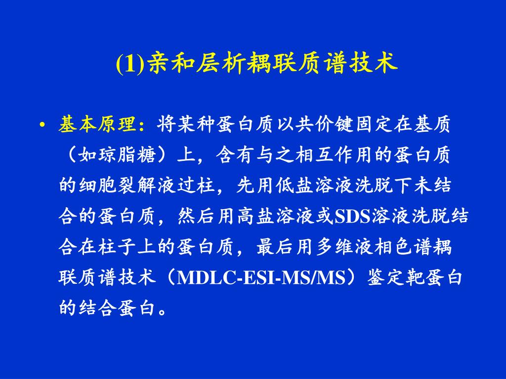 (1)亲和层析耦联质谱技术 • 基本原理:将某种蛋白质以共价键固定在基质(如琼脂糖)上,含有与之相互作用的蛋白质的细胞裂解液过柱,先用低盐溶液洗脱下未结合的蛋白质,然后用高盐溶液或SDS溶液洗脱结合在柱子上的蛋白质,最后用多维液相色谱耦联质谱技术(MDLC-ESI-MS/MS)鉴定靶蛋白的结合蛋白。