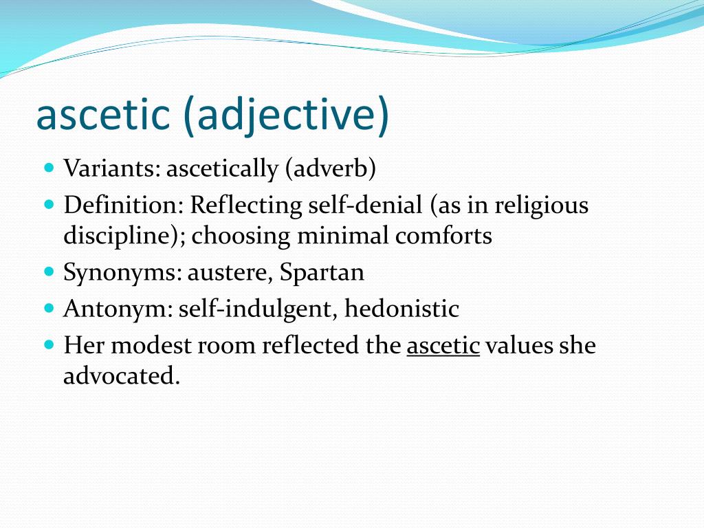 ascetic (adjective) • Variants: ascetically (adverb) • Definition: Reflecting self-denial (as in religious discipline); choosing minimal comforts • Synonyms: austere, Spartan • Antonym: self-indulgent, hedonistic • Her modest room reflected the ascetic values she advocated.