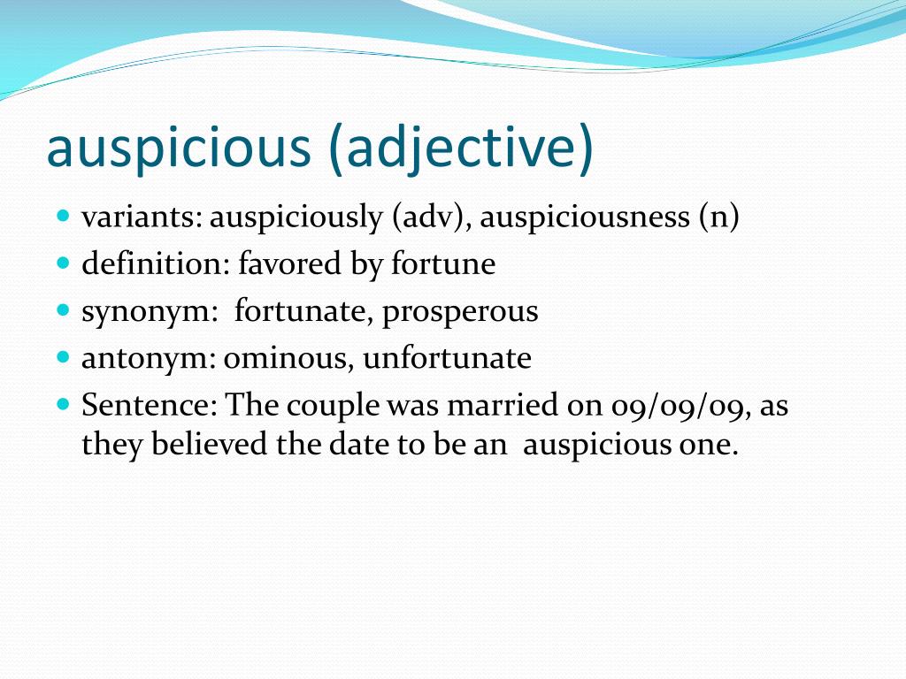 auspicious (adjective) • variants: auspiciously (adv), auspiciousness (n) • definition: favored by fortune • synonym: fortunate, prosperous • antonym: ominous, unfortunate • Sentence: The couple was married on 09/09/09, as they believed the date to be an auspicious one.