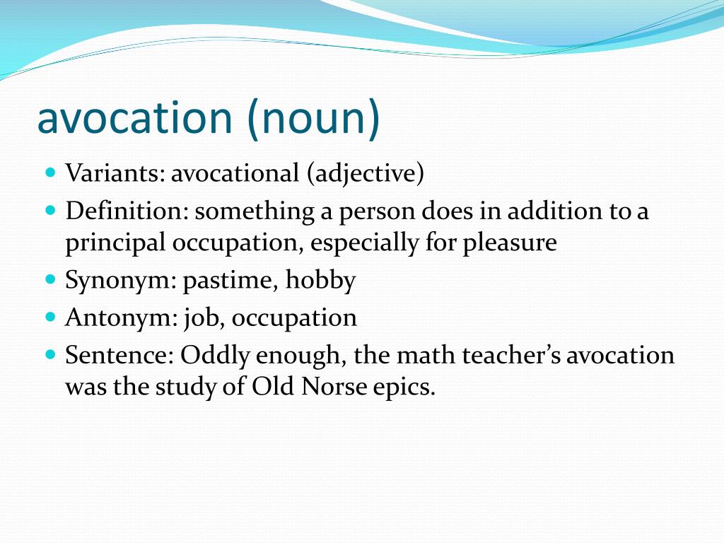 avocation (noun) • Variants: avocational (adjective) • Definition: something a person does in addition to a principal occupation, especially for pleasure • Synonym: pastime, hobby • Antonym: job, occupation • Sentence: Oddly enough, the math teacher’s avocation was the study of Old Norse epics.